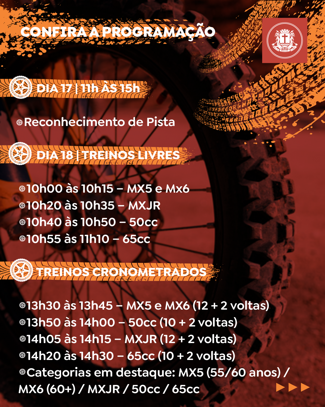 Categorias em destaque: MX5 (55/60 anos) / MX6 (60+) / MXJR / 50cc / 65cc