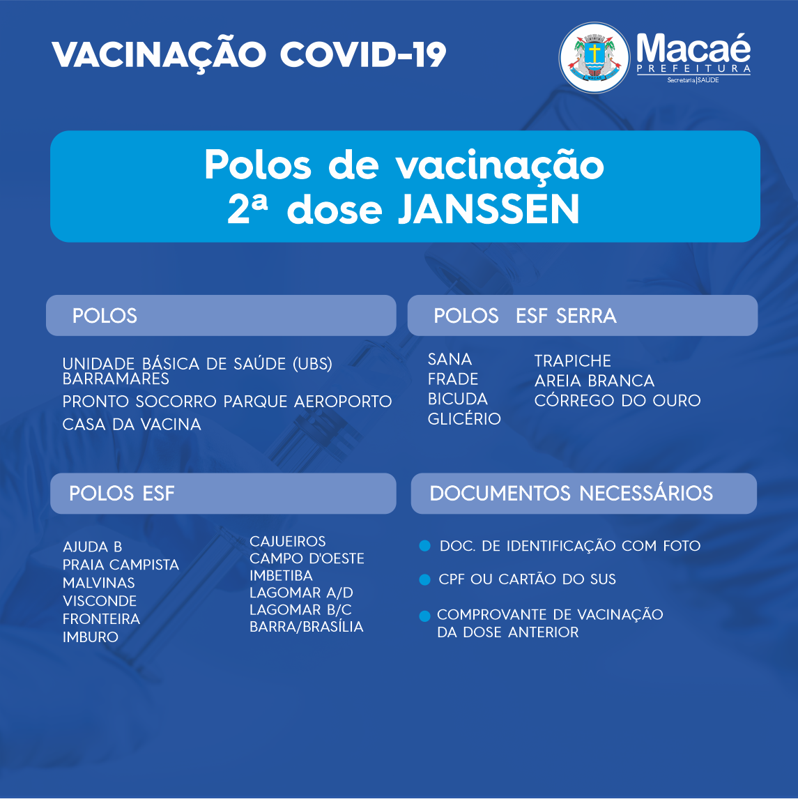 Janssen - A Segunda Dose de Janssen é aplicada para todas as pessoas vacinadas com a Dose Única da mesma vacina com prazo completo de dois meses. É preciso apresentar Comprovante de Vacinação da Dose Única, documento de identificação com foto, além de CPF ou Cartão do SUS.