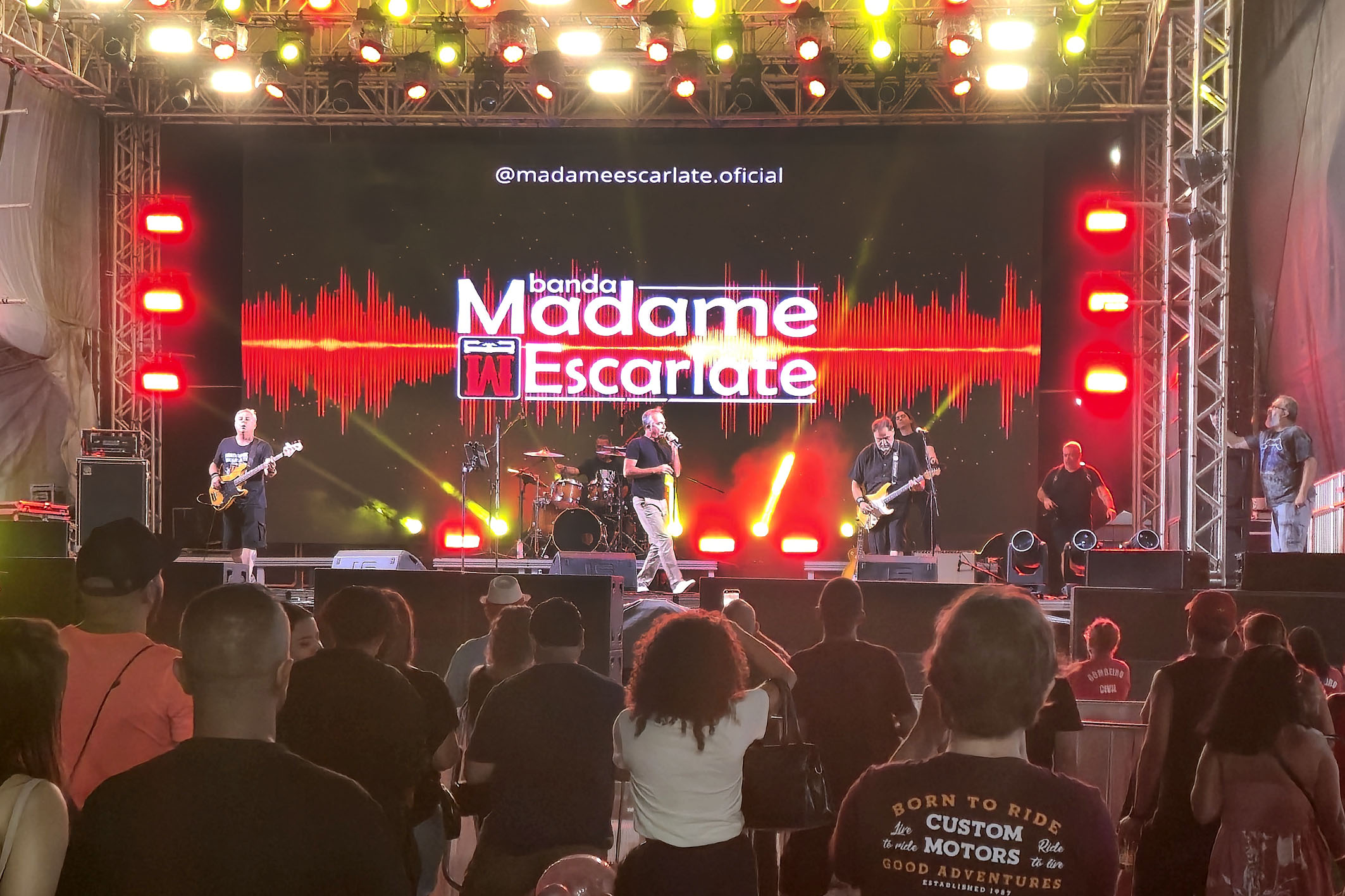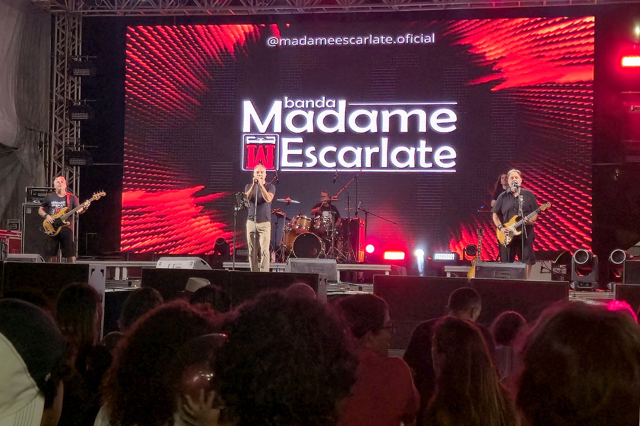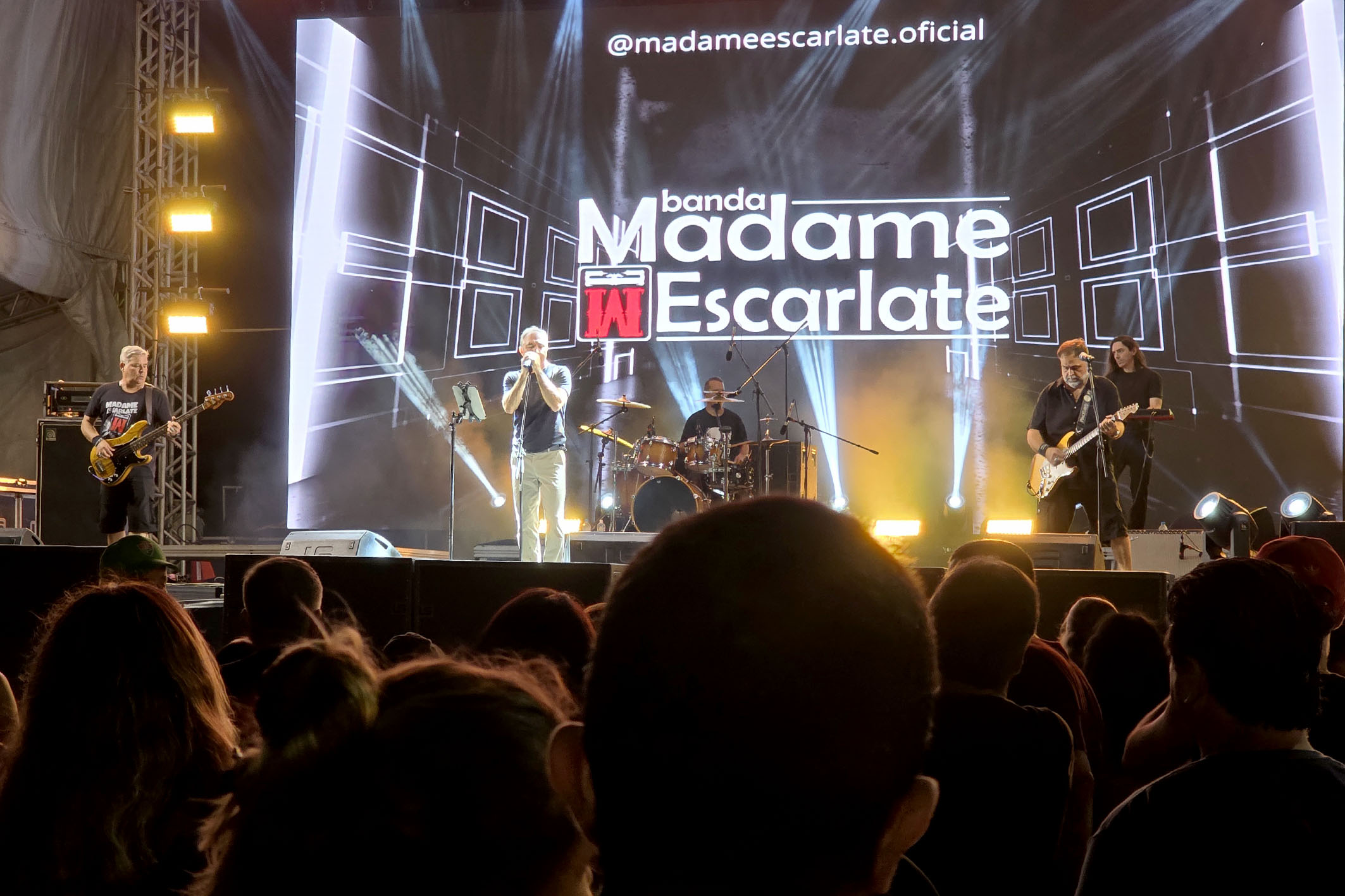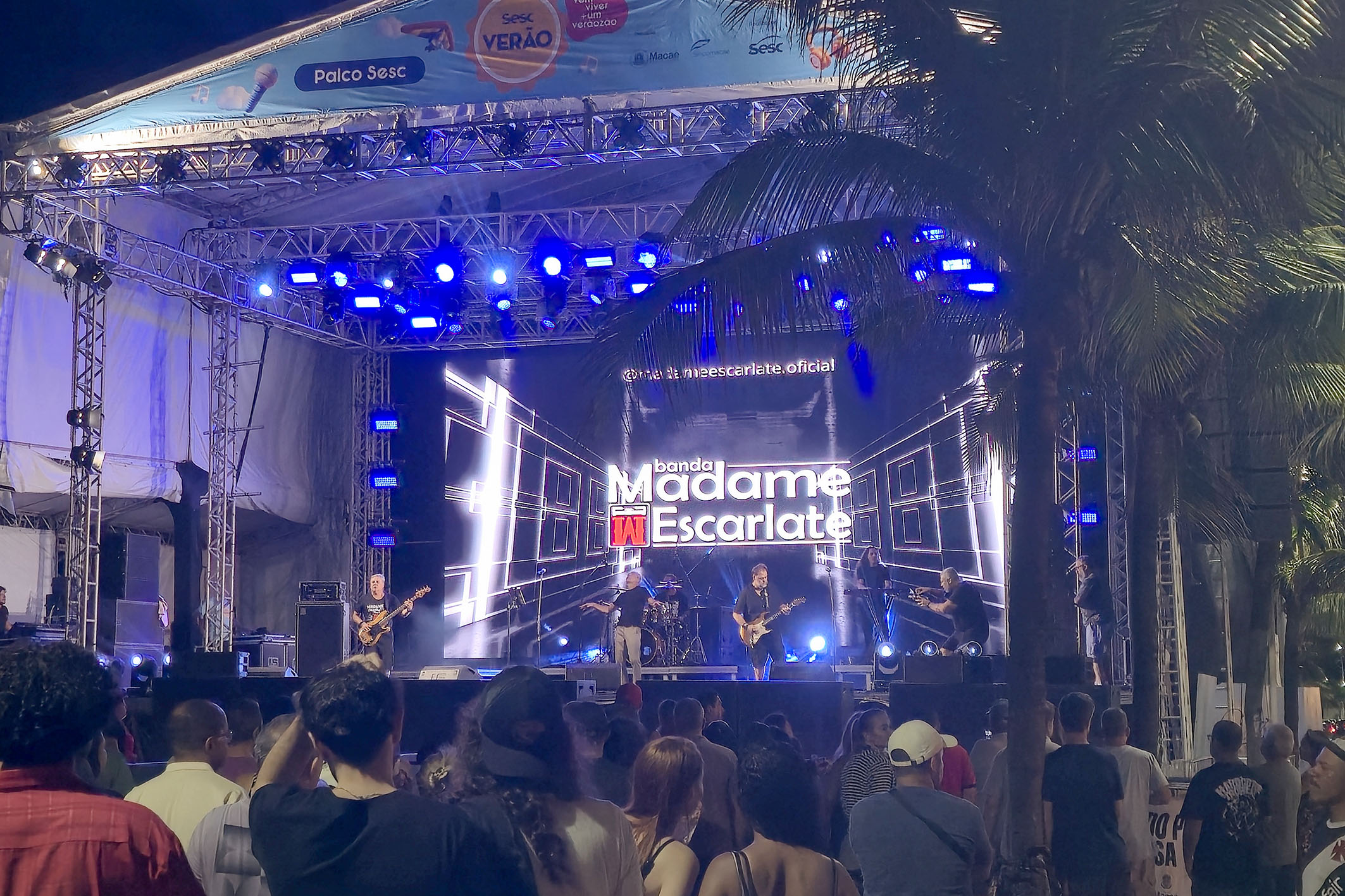Com a energia lá em cima, a banda Madame Escarlate agitou o público na noite desta sexta-feira (30) na programação do Sesc Verão, em parceria com a Prefeitura de Macaé. O show, realizado no palco dos Cavaleiros, reuniu uma série de sucessos do rock nacional e internacional das décadas de 80, 90 e 2000 como Is This Love, do Whitesnake e Pro Dia Nascer Feliz, do Barão Vermelho.
