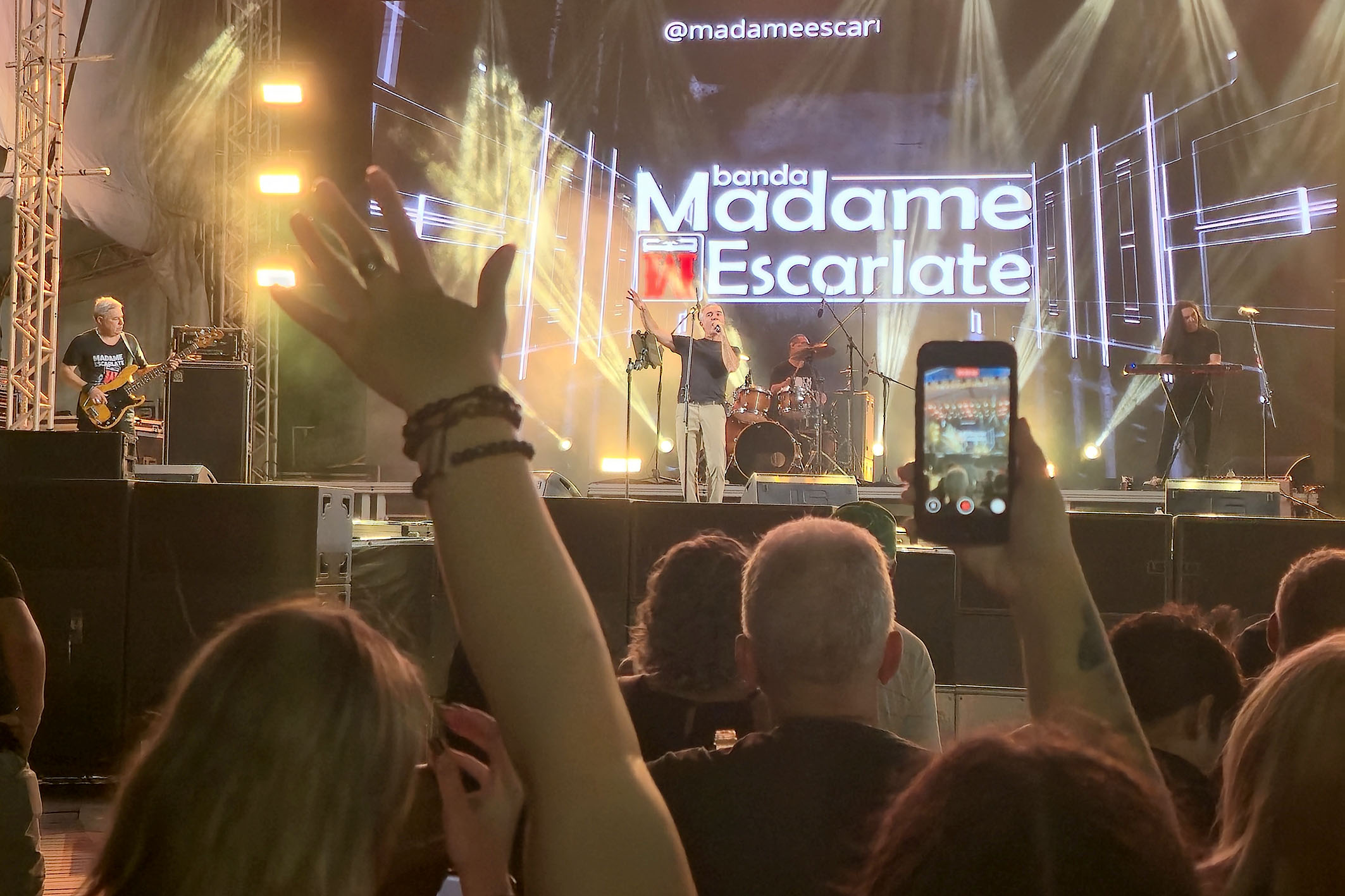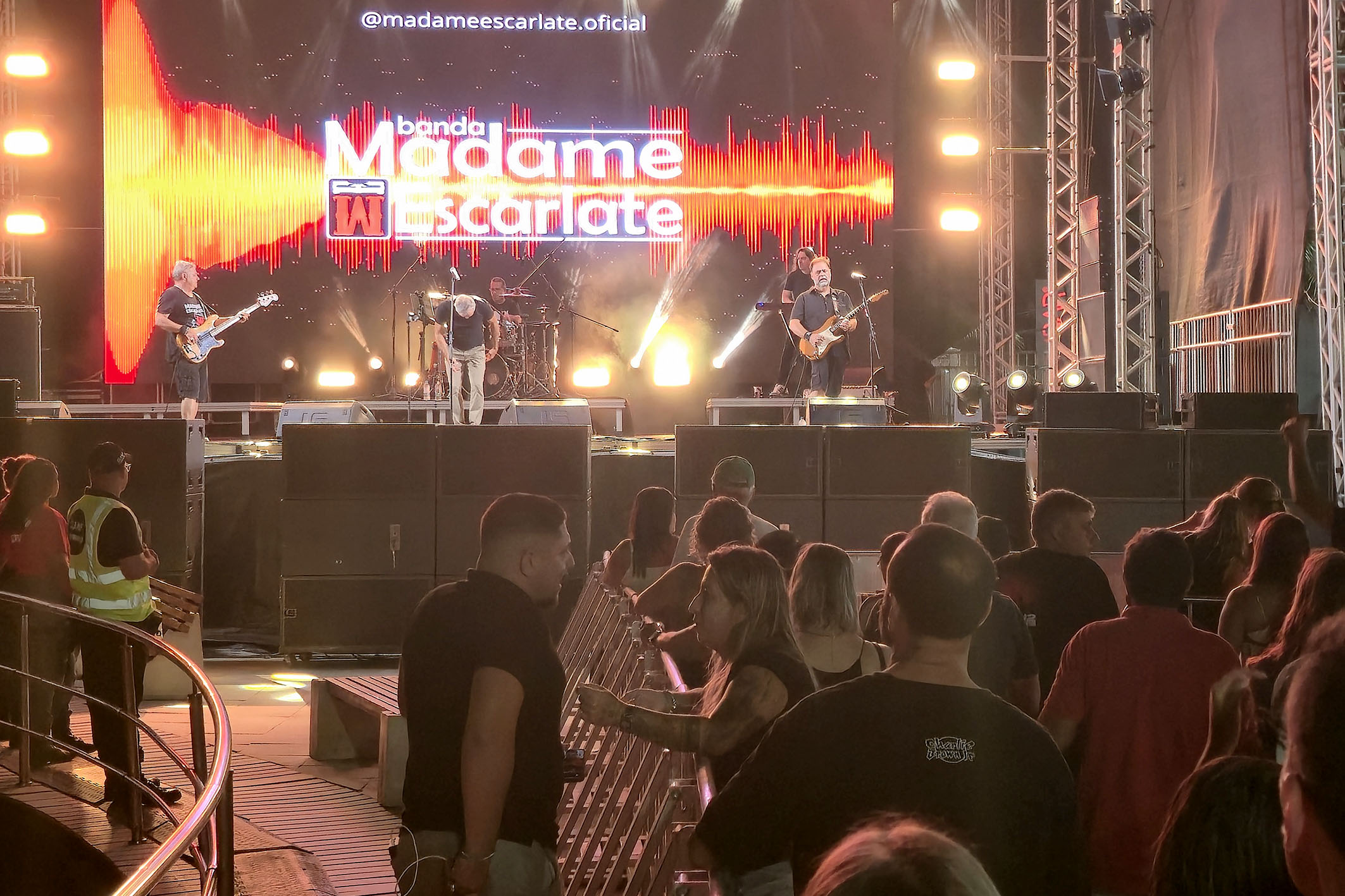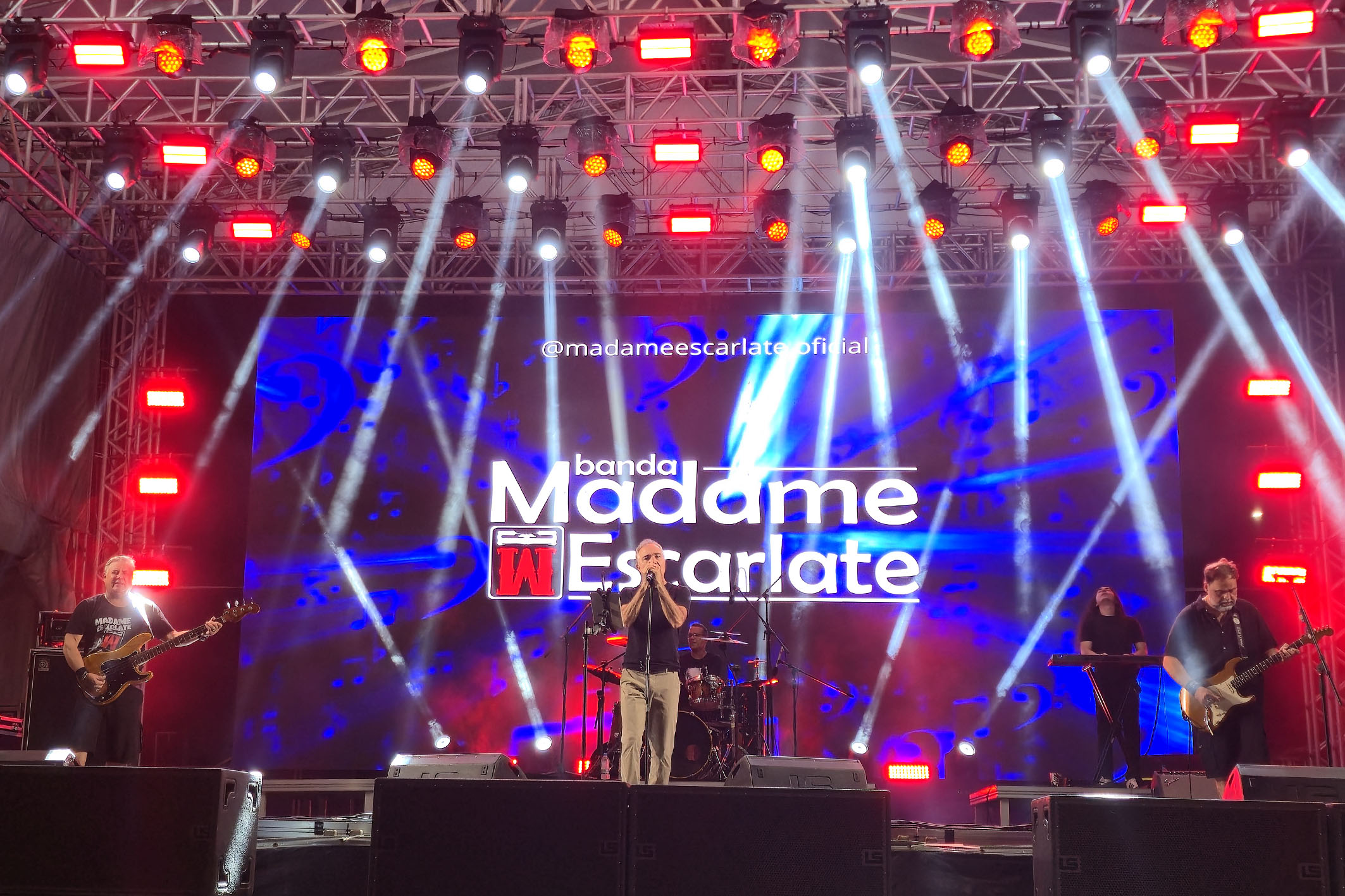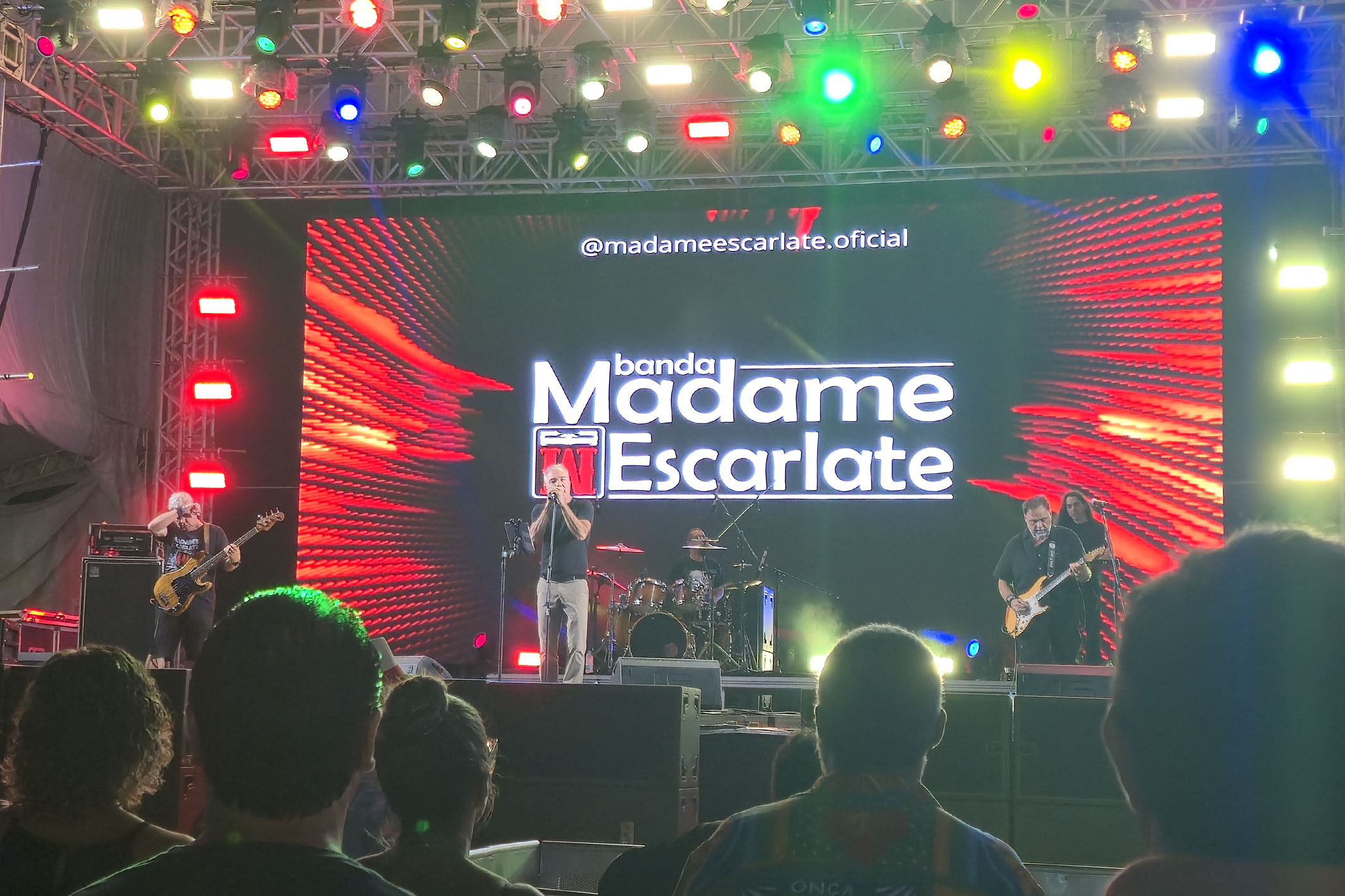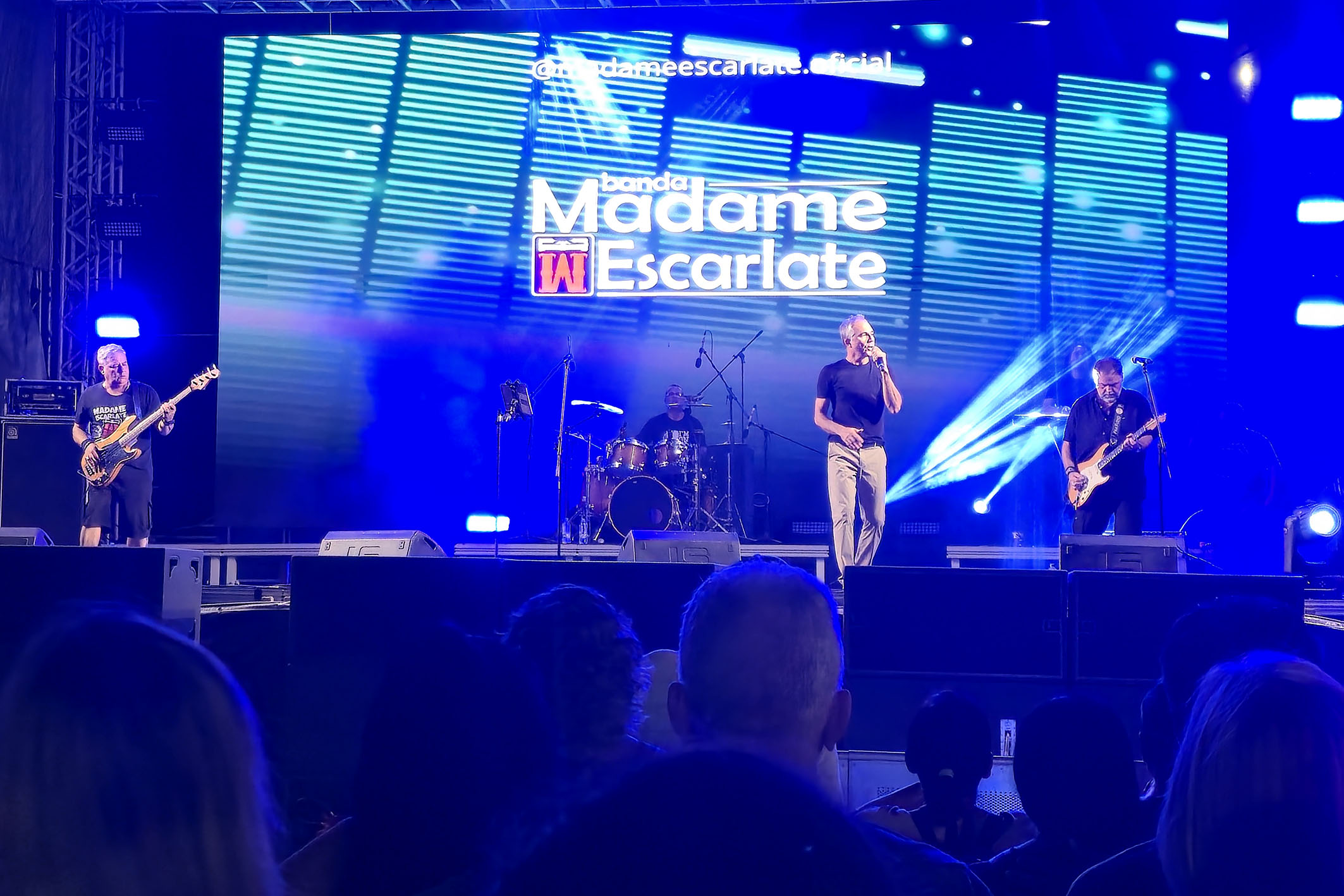 Com a energia lá em cima, a banda Madame Escarlate agitou o público na noite desta sexta-feira (30) na programação do Sesc Verão, em parceria com a Prefeitura de Macaé. O show, realizado no palco dos Cavaleiros, reuniu uma série de sucessos do rock nacional e internacional das décadas de 80, 90 e 2000 como Is This Love, do Whitesnake e Pro Dia Nascer Feliz, do Barão Vermelho.