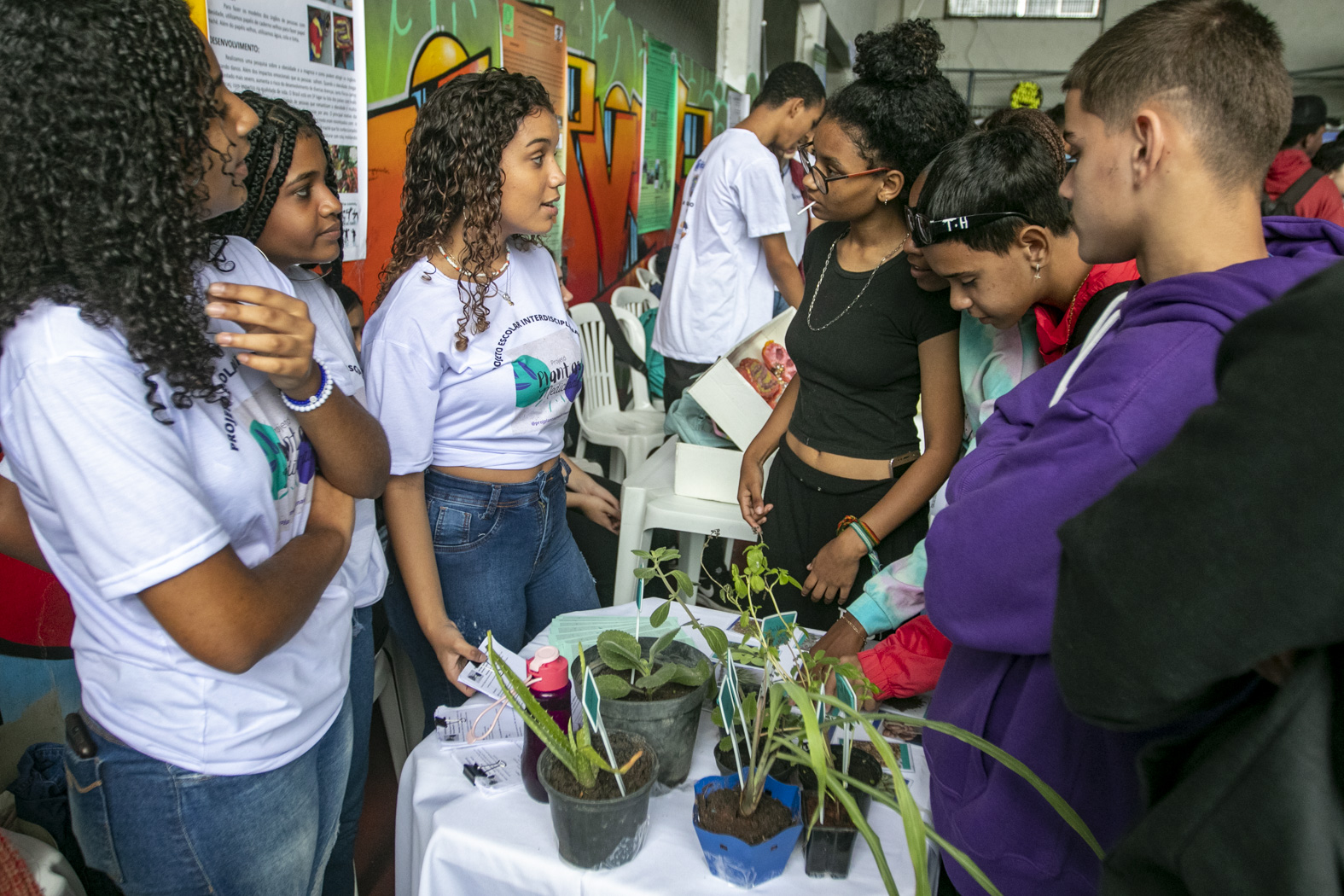 Os alunos do nono ano do ensino fundamental da EM Olga Benário Prestes, Maria Clara Sá e Hiago Pinheiro dos Santos, falaram sobre seu projeto. “Nosso projeto consiste em coletar e descartar corretamente óleo de cozinha. Nós coletamos na comunidade. Hoje, nós temos parceria com uma empresa que compra o óleo e nós usamos o dinheiro na escola. Temos também uma parceria com o NUPEM – UFRJ. Eles doaram um coletor para a gente. Esse projeto surgiu em 2018, com outros alunos, e hoje é um projeto fixo na escola e uma referência para nossa comunidade”.