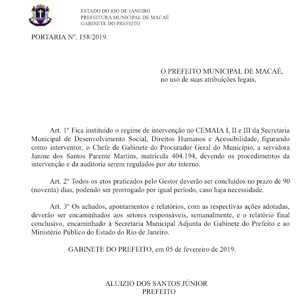 A Prefeitura de Macaé informa ter instaurado regime de intervenção nos Centros Municipais de Apoio à Infância e à Adolescência - Cemaia I, II e III, administrados pela Secretaria Municipal de Desenvolvimento Social, Direitos Humanos e Acessibilidade, por meio da portaria n° 158/2019, nomeando um representante da Procuradoria Geral do Município para analisar a regularidade das atividades no que diz respeito ao nível administrativo da instituição.