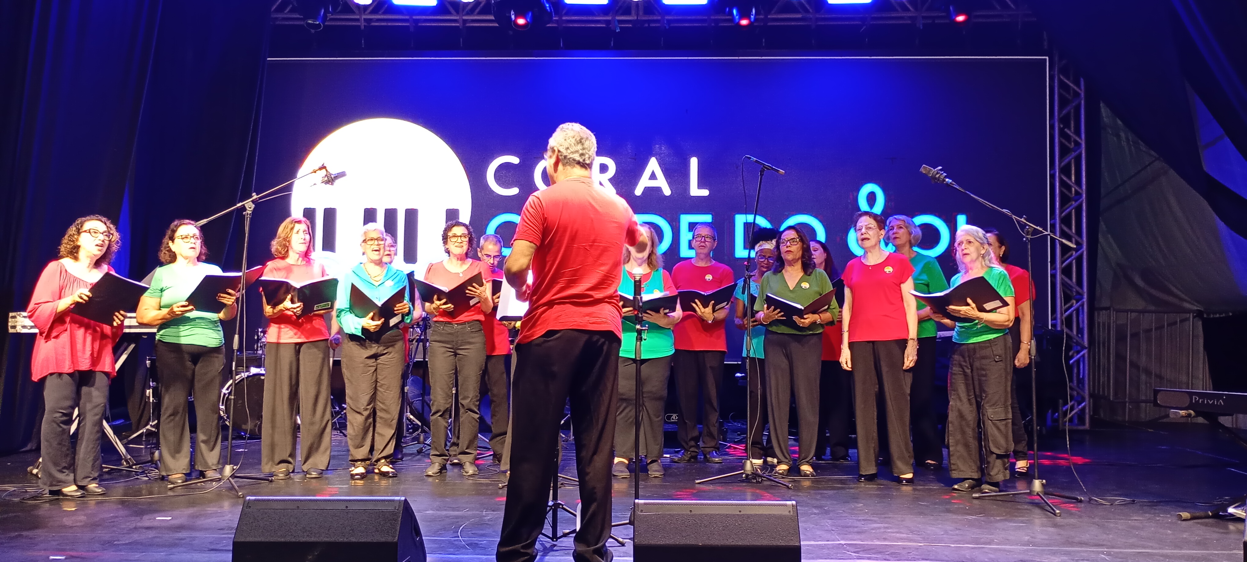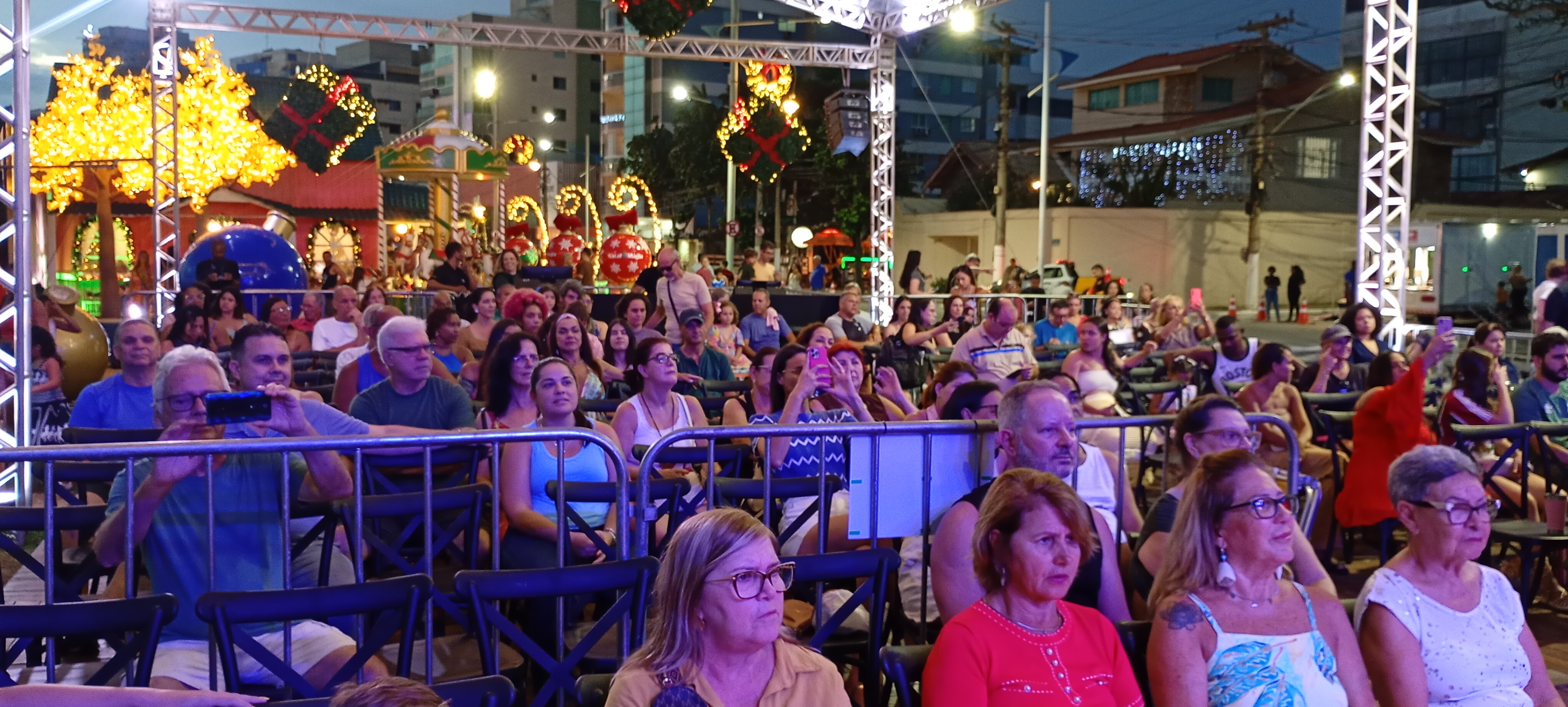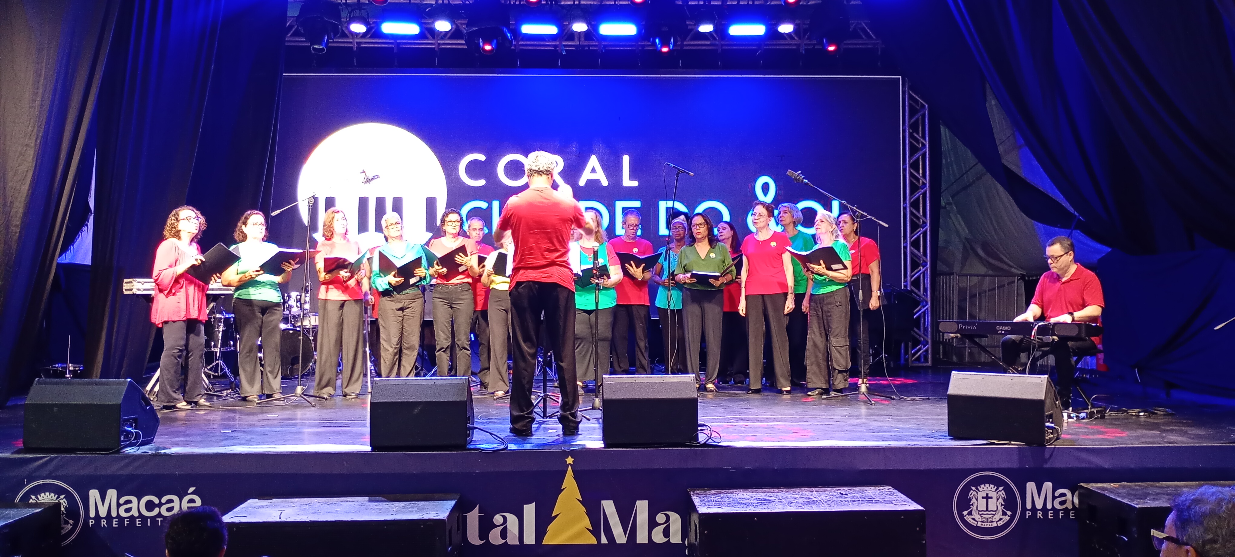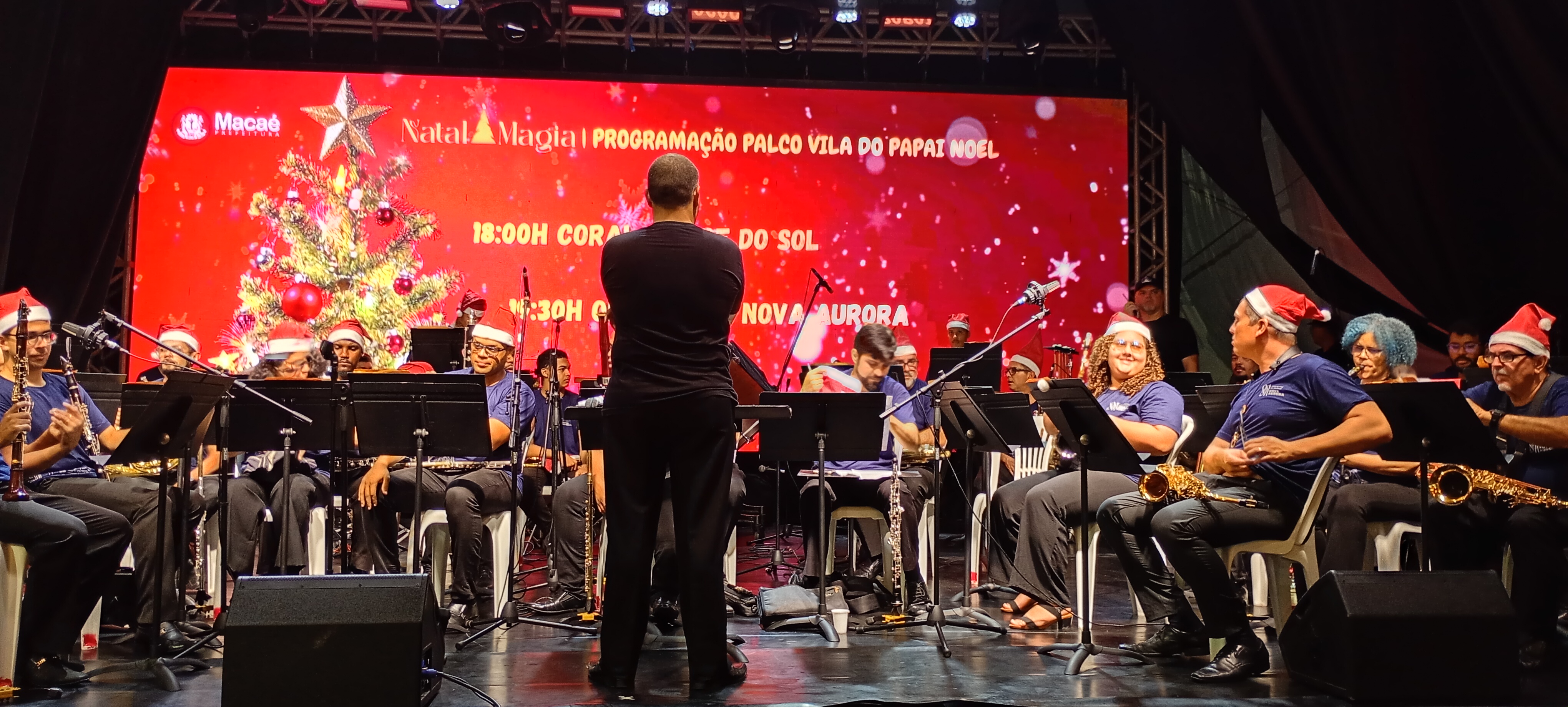 A Vila do Papai Noel recebeu, neste domingo (14), mais uma noite de grande movimentação e música ao vivo, reunindo famílias e visitantes a partir das 17 horas. A Orquestra de Sopros Nova Aurora (OSNA) e o Coral Cidade do Sol foram os destaques da programação, levando ao público um repertório preparado especialmente para o clima natalino. O espetáculo integrou a agenda cultural do Natal Magia, promovido pela Prefeitura de Macaé.