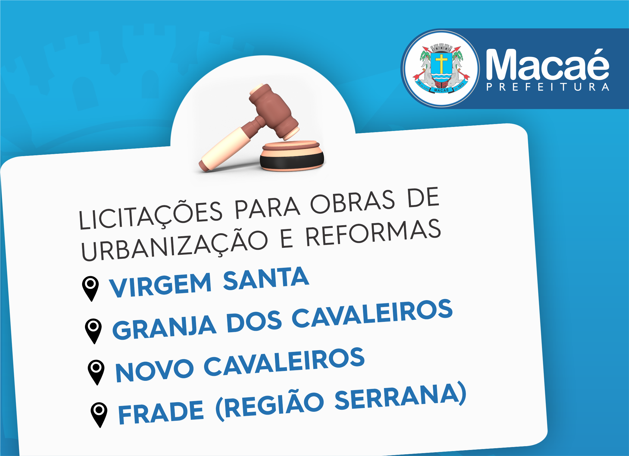 A Prefeitura de Macaé realizará a licitação de obras de urbanização e reforma em diversos pontos do município no mês de julho. Serão contemplados os bairros Virgem Santa, Granja dos Cavaleiros, Novo Cavaleiros, além do Frade (Região Serrana). O objetivo é avançar nos serviços oferecidos à população para promover qualidade de vida. Os editais estão disponíveis aqui no site www.macae.rj.gov.br ou na sede da Secretaria adjunta de Obras, localizada na Avenida Camilo Nogueira da Gama, 250, Novo Botafogo.