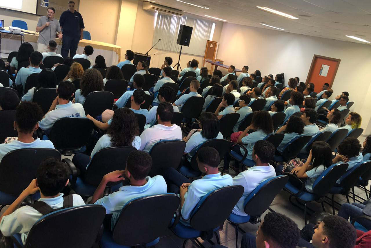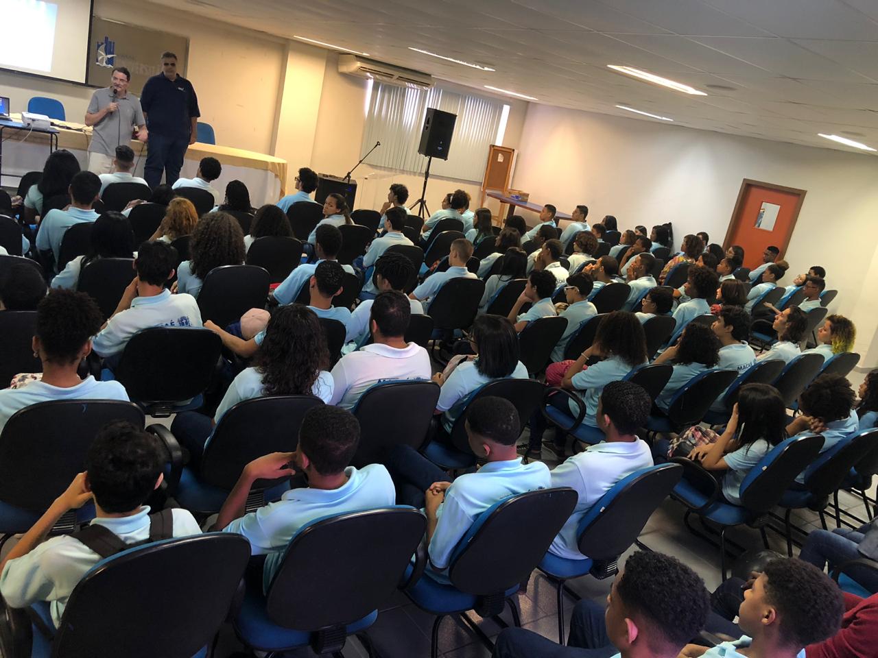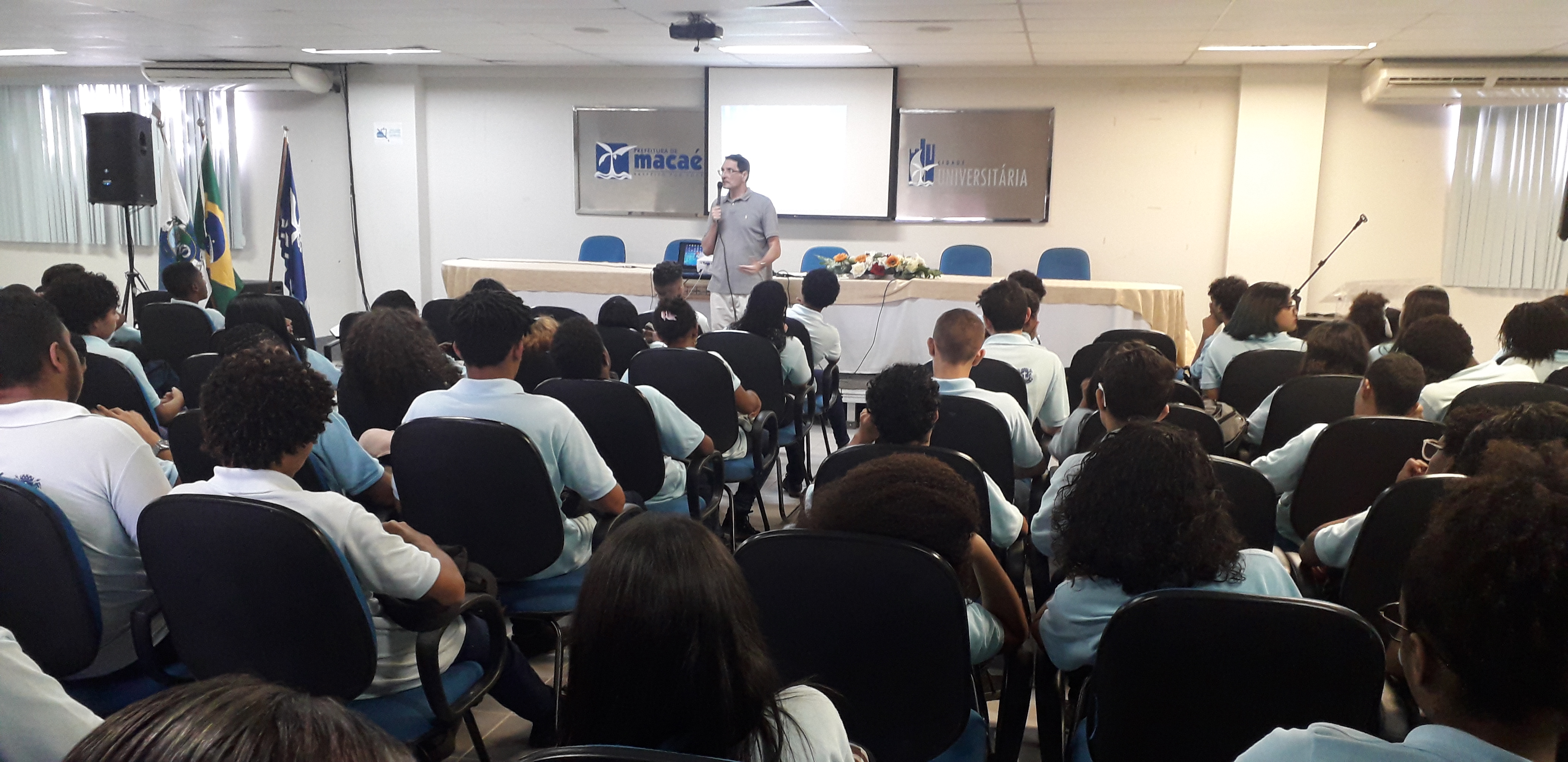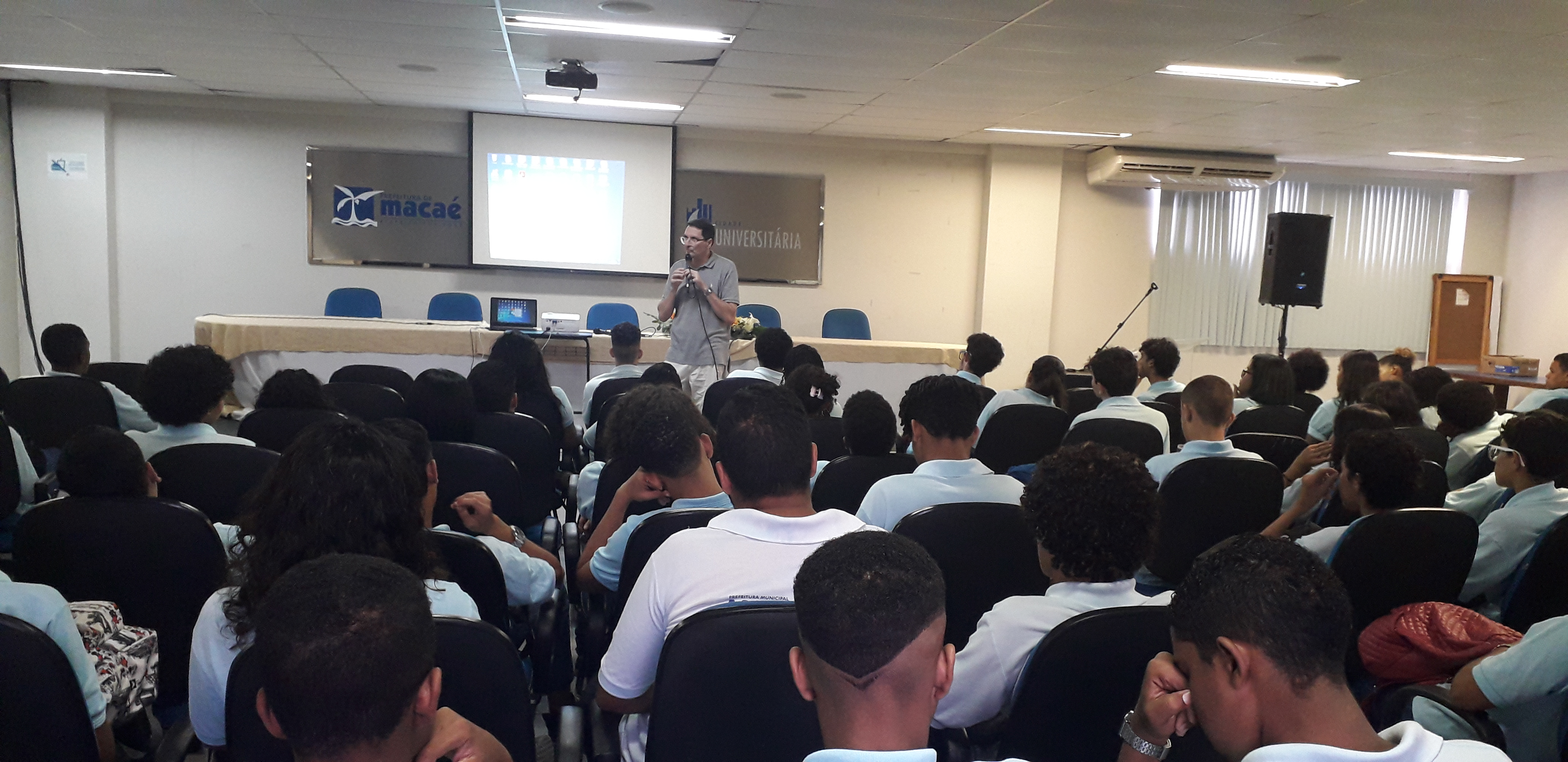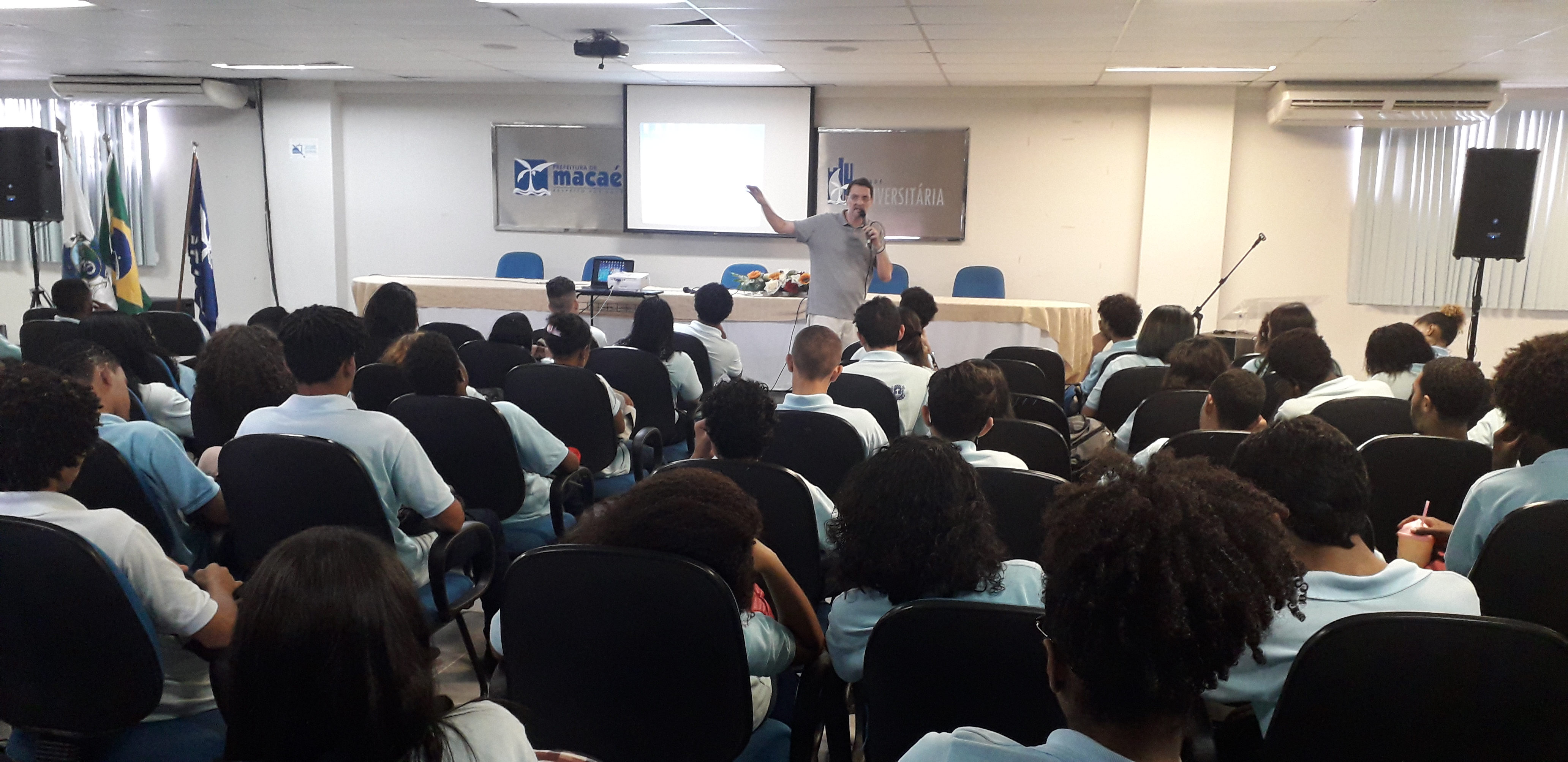 Dentro do trabalho da Prefeitura de Macaé de fomentar políticas públicas para a infância e a juventude, 180 jovens, entre 14 e 17 anos, do Programa Nova Vida, participaram de mais uma etapa do curso de formação oferecido pela Prefeitura de Macaé, na tarde desta sexta-feira (28), no auditório Claudio Ulpiano, bloco A, da Cidade Universitária. São jovens matriculados no Ensino Médio que, em breve, poderão estar cursando uma faculdade e ficaram atentos à palestra ministrada pelo secretário adjunto municipal de Ensino Superior, Márcio Magini, que apresentou a Cidade Universitária com os 18 cursos de graduação e sete de pós-graduação oferecidos, gratuitamente, pela FeMASS, UFF e UFRJ.