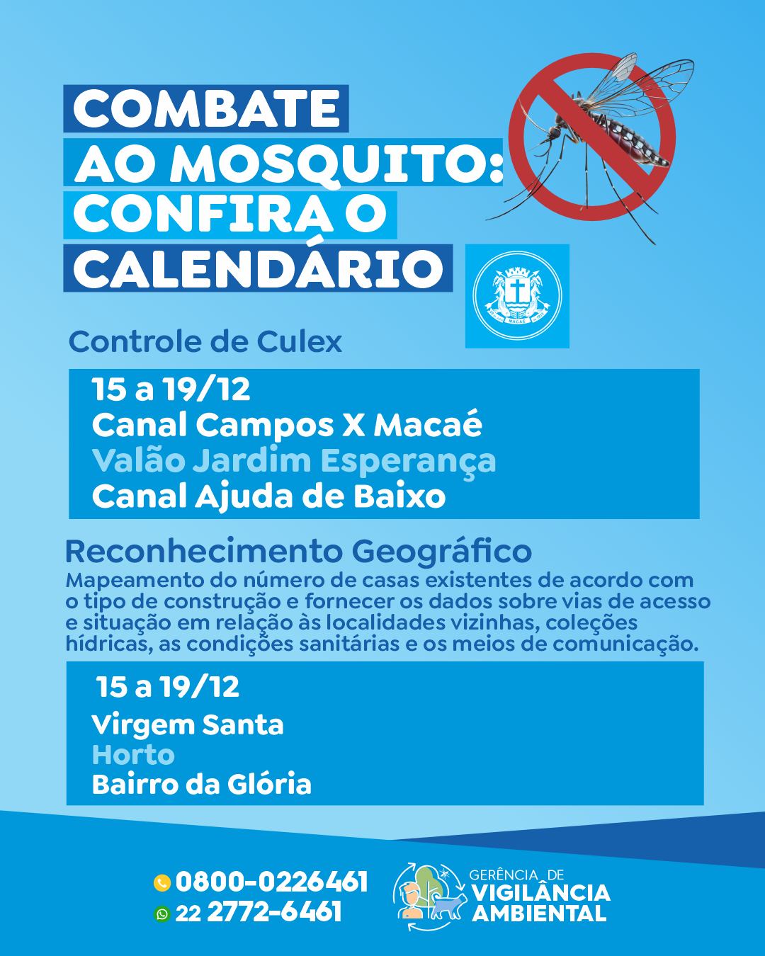 O controle do mosquito Culex também integra o cronograma de ações e será realizado entre os dias 15 e 19 de dezembro em pontos específicos do município, como o Canal Campos x Macaé, o Valão do Jardim Esperança e o Canal da Ajuda de Baixo.