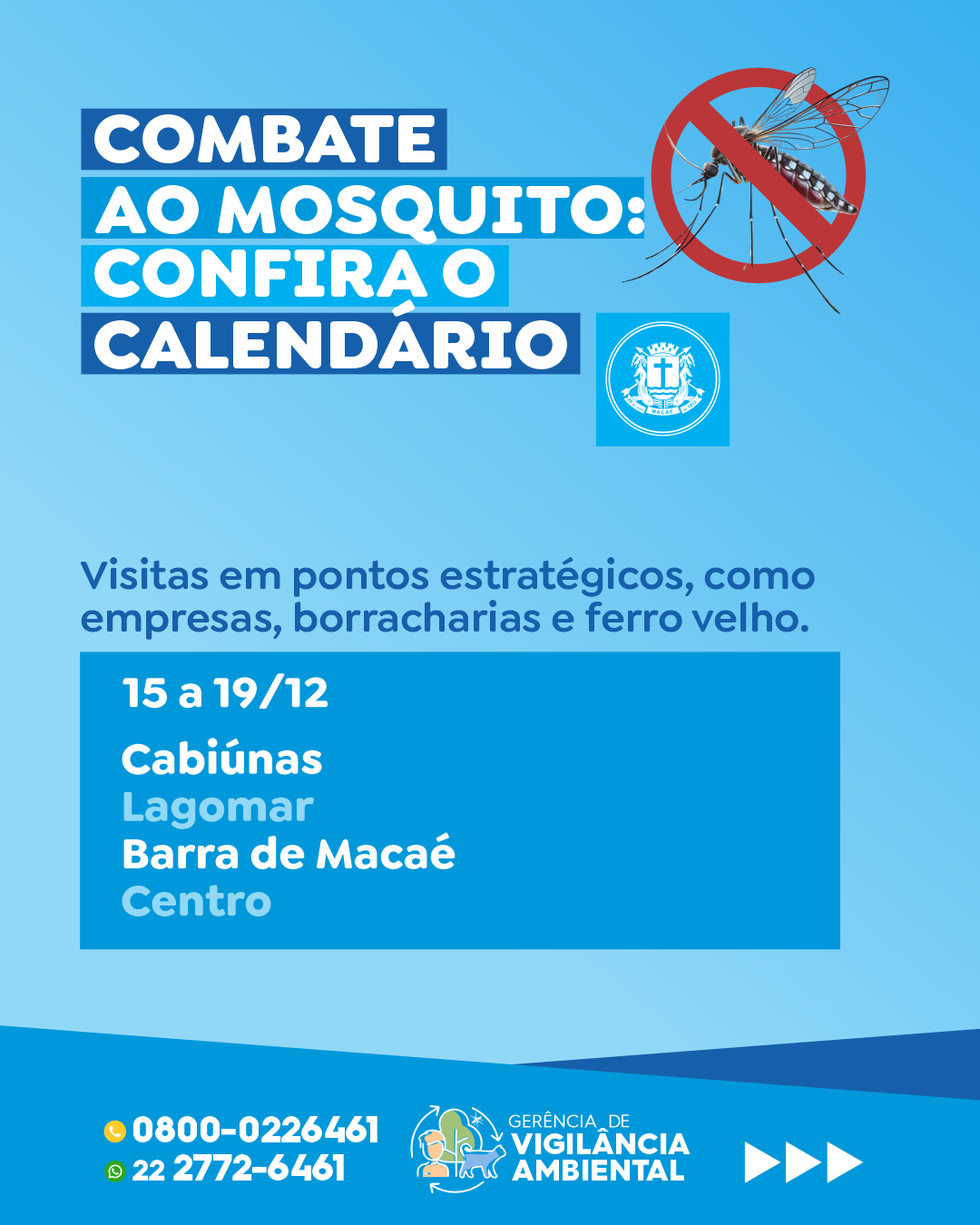 A Prefeitura de Macaé, por meio da Gerência de Vigilância Ambiental da Secretaria de Saúde, continua na próxima semana a série de ações integradas de prevenção, controle de vetores e promoção da saúde em diversas localidades do município.