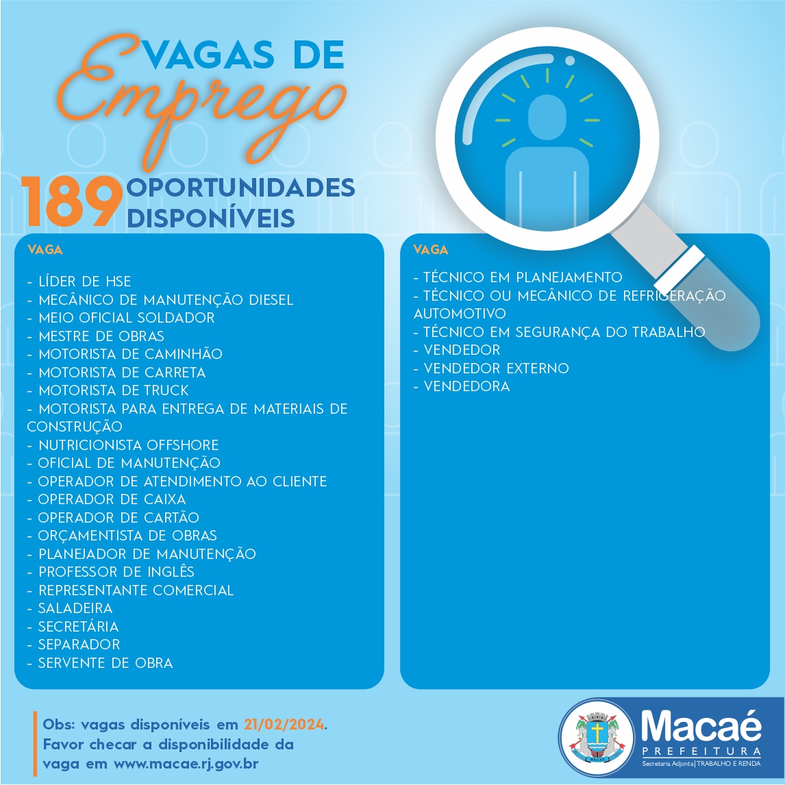 Quem está à procura de uma oportunidade de emprego deve ficar atento. A Prefeitura de Macaé, por meio da Secretaria Adjunta de Trabalho e Renda, divulgou 189 oportunidades de emprego nesta semana. São oferecidas diversas vagas, entre elas ajudante de cozinha, padaria, assistente administrativo, eletricista, inspetor de solda e jovem aprendiz. As opções são para vários níveis de escolaridade (Fundamental, Médio, Técnico e Superior).