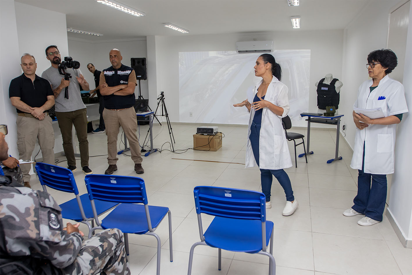 O treinamento conta ainda com o acompanhamento de psicóloga, que realiza a observação técnica dos aspectos emocionais, cognitivos e comportamentais envolvidos na tomada de decisão, avaliando reações ao estresse, capacidade de julgamento, controle emocional e aderência aos princípios da legalidade, proporcionalidade e preservação da vida.
