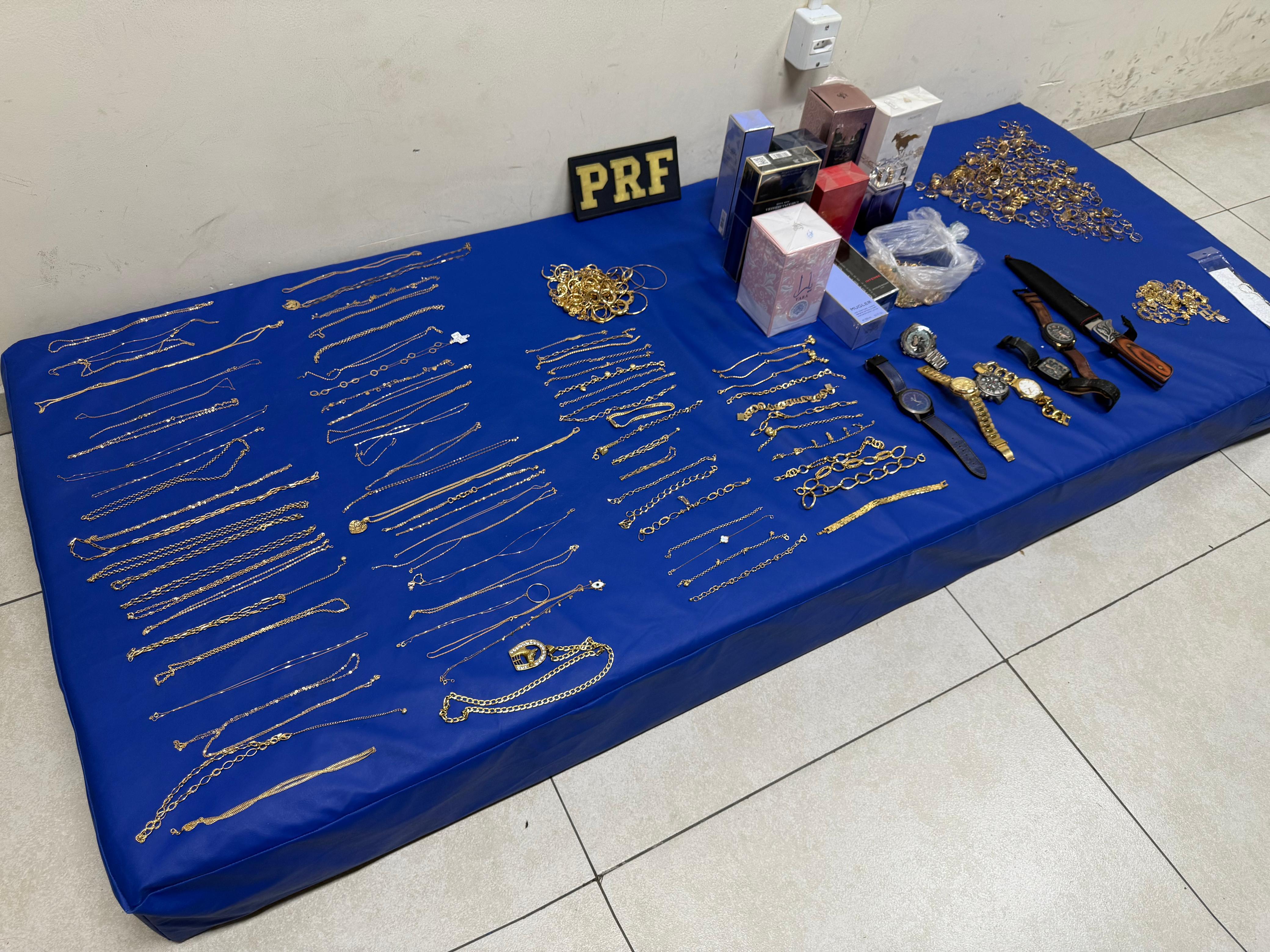 A equipe da Unidade Operacional da PRF, em Casimiro de Abreu, localizou e abordou, no km 202 da BR-101, um automóvel GM Onix suspeito de envolvimento no crime. Durante a fiscalização, os ocupantes apresentaram versões contraditórias sobre a viagem e optaram pelo silêncio. Na busca veicular, foram encontradas duas necessaires contendo joias, relógios e perfumes, totalizando cerca de 1,26 kg de ouro.