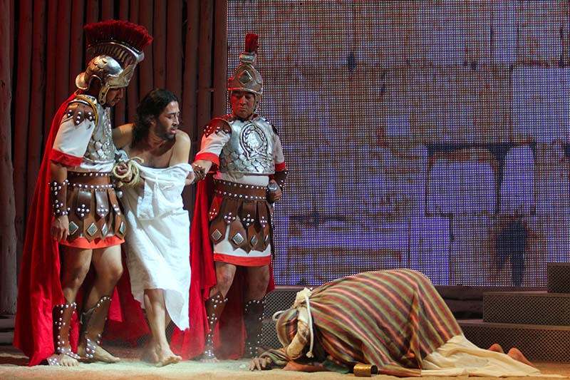 Ele discute com os fariseus que questionam sua autoridade. “Os humildes serão exaltados e os exaltados serão humilhados”, responde aos mestres da lei. Libertou Maria Madalena da prostituição, a qual O ama com forte amor e gratidão. Judas que O traiu por trinta moedas de prata dá um beijo Nele para que os guardas o identificassem e o prendessem. No monte das Oliveiras, Jesus ora ao Pai: “Pai, se possível afasta de mim este cálice. Mas não seja feita a minha vontade, mas a Tua”.