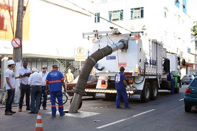 O caminhão Super Vácuo, faz a limpeza de boca de lobo, poços de visita, ramais, galerias, estação de tratamento de esgoto e elevatórias