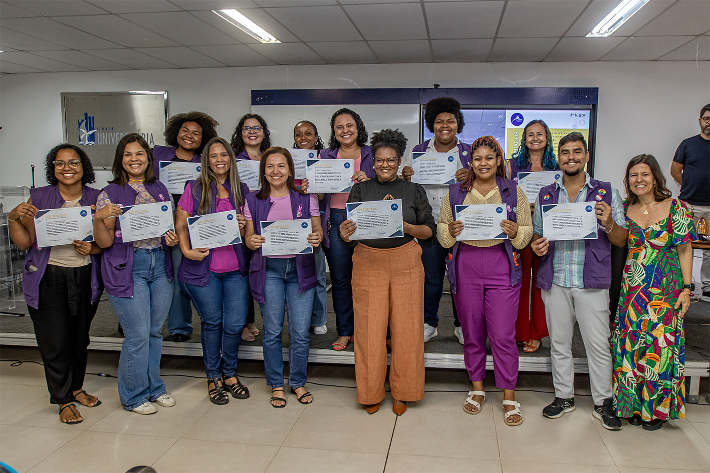 Na categoria ‘Pequenas Iniciativas’, o primeiro lugar foi do projeto “Educação Antirracista no Colégio Municipal Botafogo: reflexões a partir da literatura, das inteligências artificiais de racismo algorítimo”. “Ocupar esses espaços que alguns insistem em dizer que não são nossos é fundamental, pois somos, em maioria, pretos ou pardos. Valeu a pena mostrar aos alunos todo um letramento antirracista”, disse a diretora da unidade de ensino, Ana Lúcia Teixeira. A professora responsável pelo projeto, Salomé Aquino, acrescentou a importância do trabalho. “Debater em sala que o racismo está até no algoritmo da inteligência artificial foi importante para que os alunos saíssem do lugar comum”, pontuou.