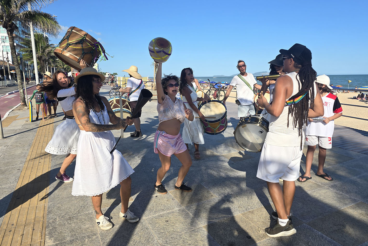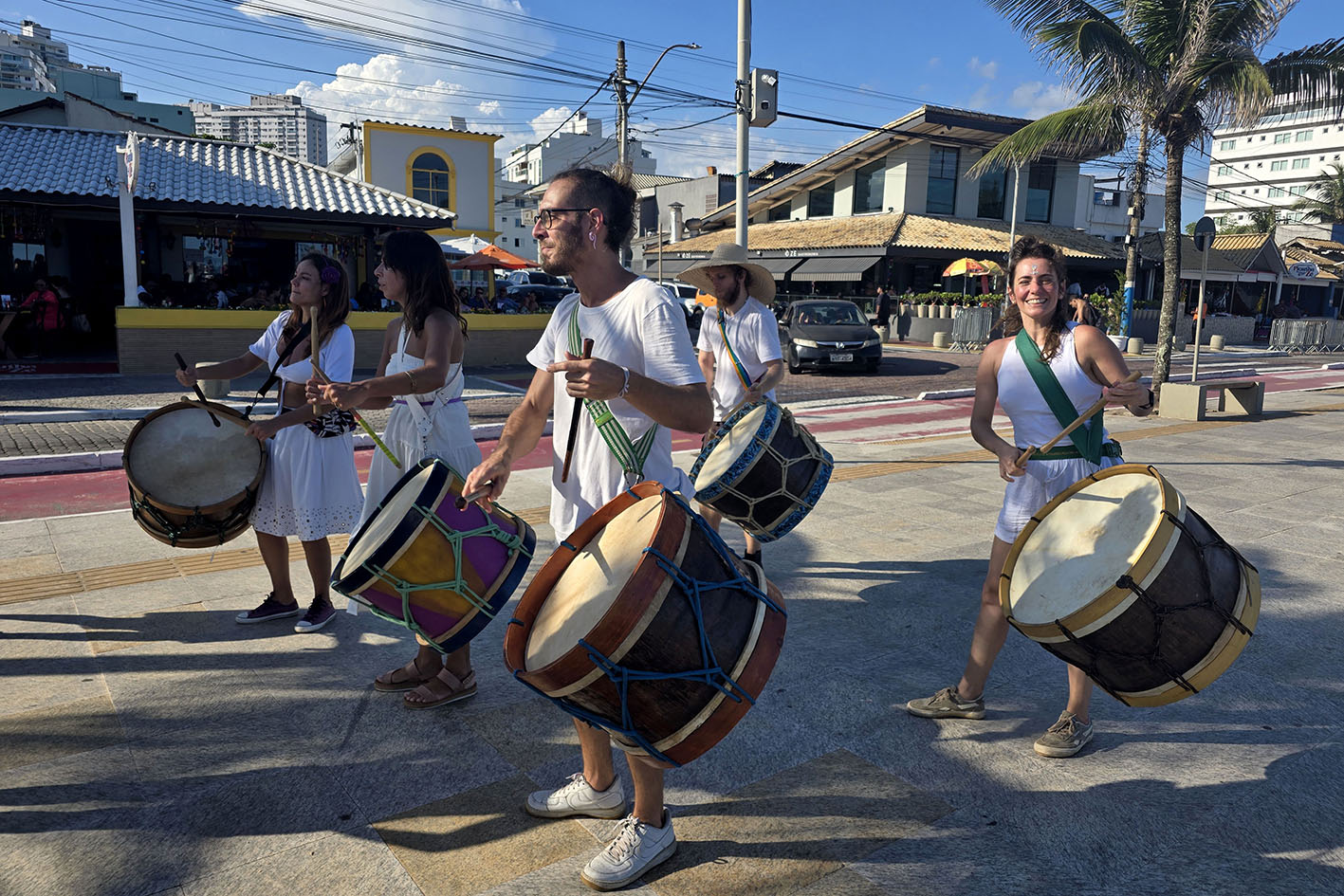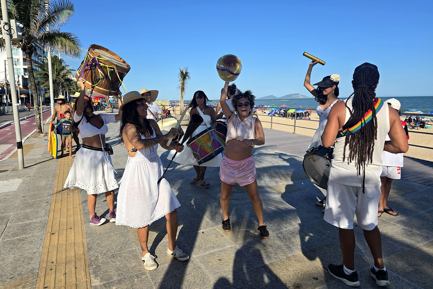 Cortejo de maracatu contagia a Praia dos Cavaleiros com ritmo, tradição e energia ancestral, durante o Carnaval da Alegria. Fotos: Ana Chaffin