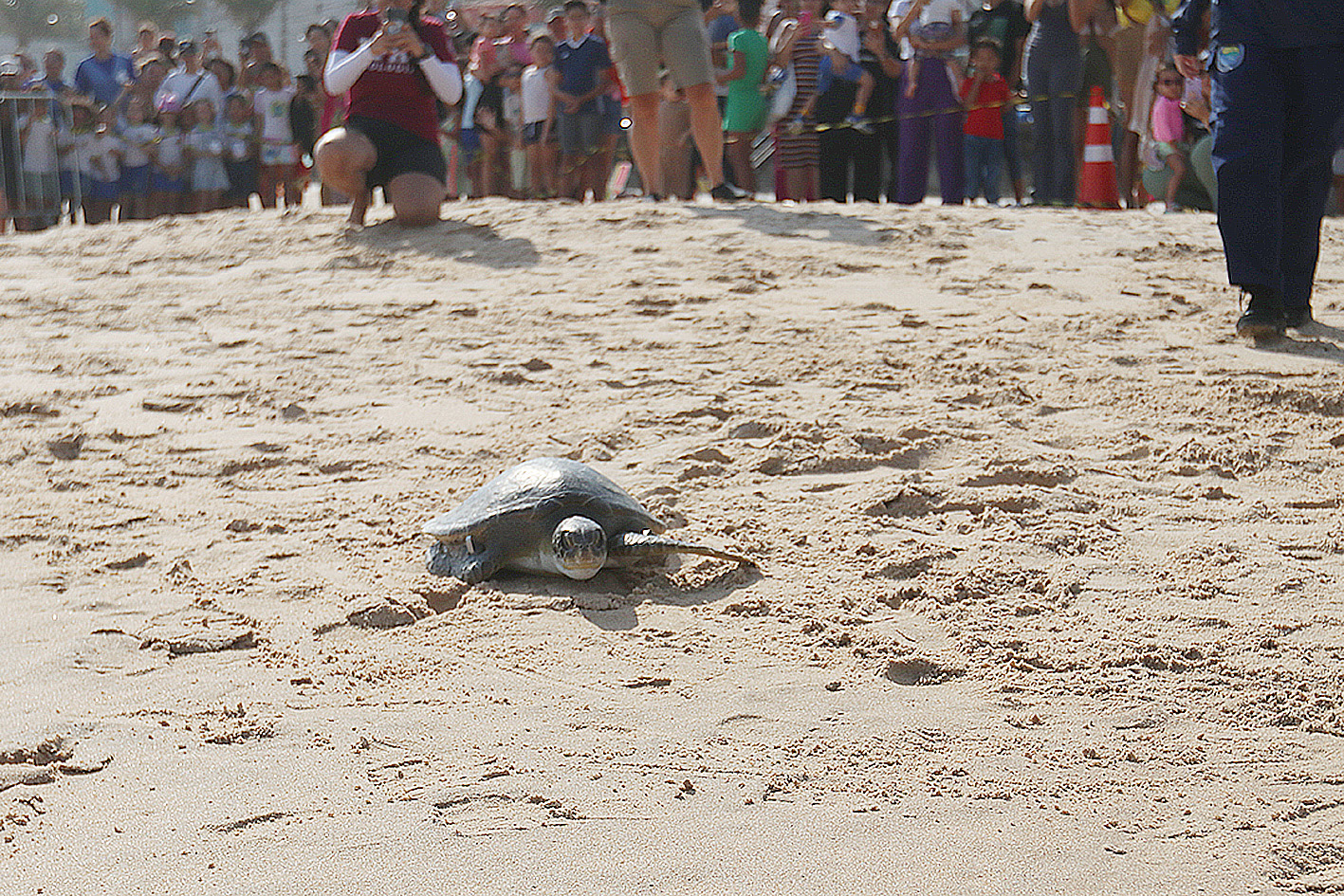 A soltura da tartaruga-verde contou com a participação da comunidade e de escolas, como a de Wolfango Ferreira.