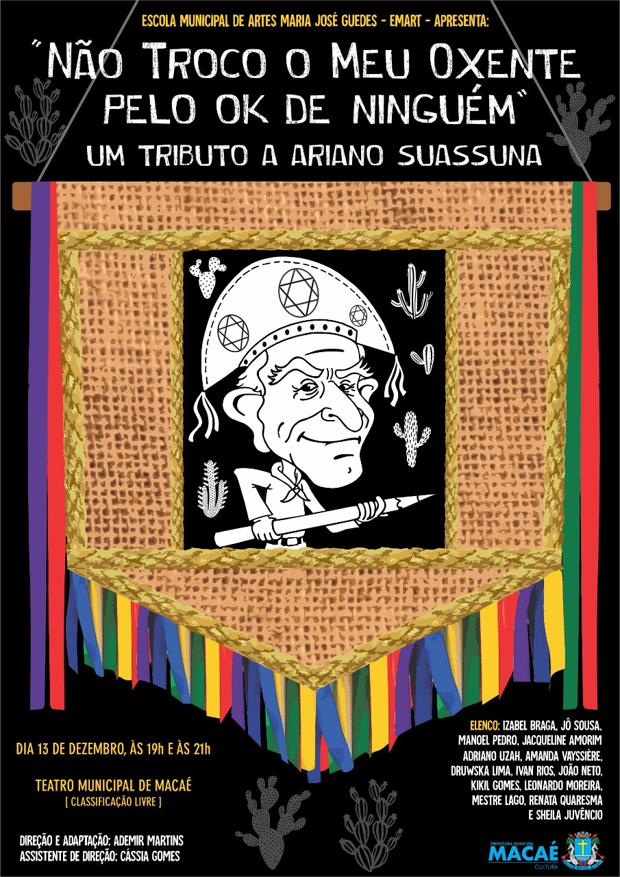 Com direção e adaptação de Ademir Martins, a turma T-17 do curso técnico de teatro da Escola Municipal de Artes Maria José Guedes (Emart) se apresenta no Teatro Municipal de Macaé, nesta sexta (13), às 19h e 21h, com a encenação de "Não troco meu Oxente pelo Ok de ninguém: um tributo a Ariano Suassuna". O espetáculo presta uma homenagem ao mestre Suassuna através da encenação de dois textos curtos de sua autoria, onde são abordadas as raízes da literatura de cordel, do espírito circense e do teatro medieval. A classificação é livre. A distribuição dos ingressos será na própria sexta, a partir das 9h, na bilheteria do teatro.