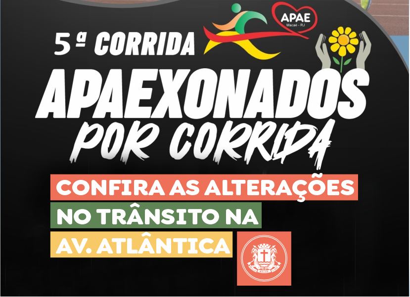 A Coordenadoria de Trânsito da Secretaria de Mobilidade Urbana informa que os condutores devem ficar atentos às alterações no trânsito na Avenida Atlântica para a realização da 5ª Corrida e Caminhada APAExonados por Corrida, organizada pela Apae Macaé, no domingo (7). A largada será às 7h, em frente à Associação Atlética Banco do Brasil (AABB).