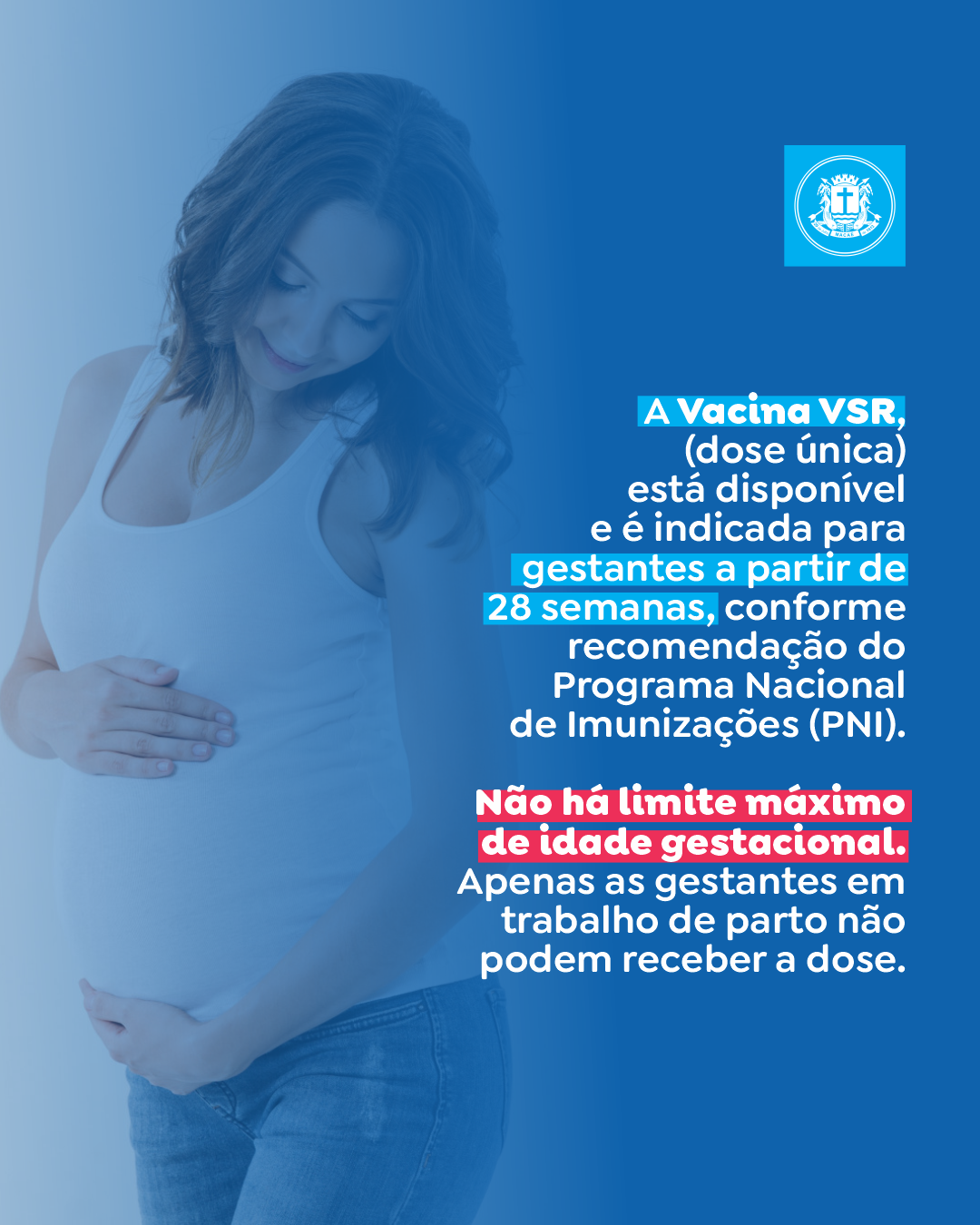 A aplicação da vacina contra o vírus sincicial respiratório (VSR) é voltada a gestantes a partir de 28 semanas de gestação e que não estejam em trabalho de parto. A ação segue recomendação do Programa Nacional de Imunizações (PNI) e tem como objetivo ampliar a proteção dos recém-nascidos contra formas graves da doença.