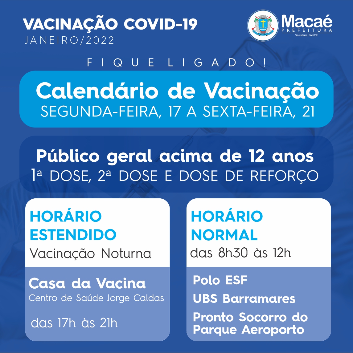 As unidades realizam a aplicação da Primeira Dose para o público geral acima de 12 anos, para a Segunda Dose de Pfizer para pessoas com retorno agendado dado até o dia 21 de janeiro, além da aplicação da Dose de Reforço para as pessoas que já completaram quatro meses da vacinação da Segunda Dose.