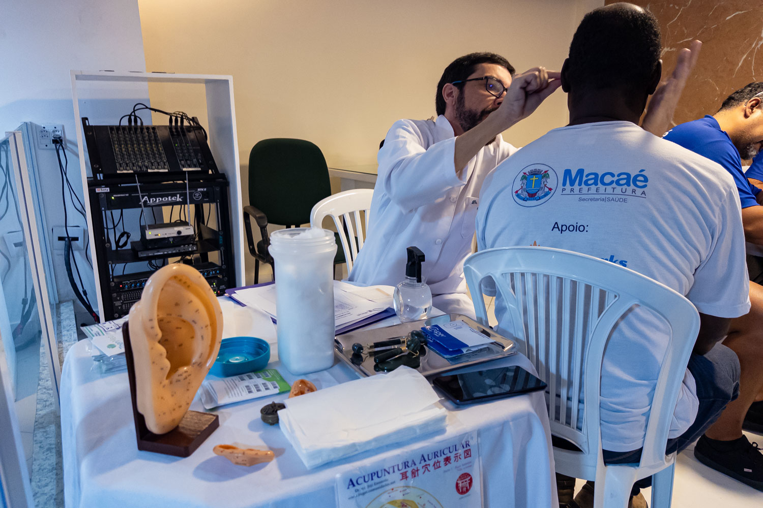 Os profissionais participaram de atividades como auriculoterapia, aferição de pressão arterial e glicemia, realização de coleta para exame de PSA, avaliação e IMC e massoterapia.