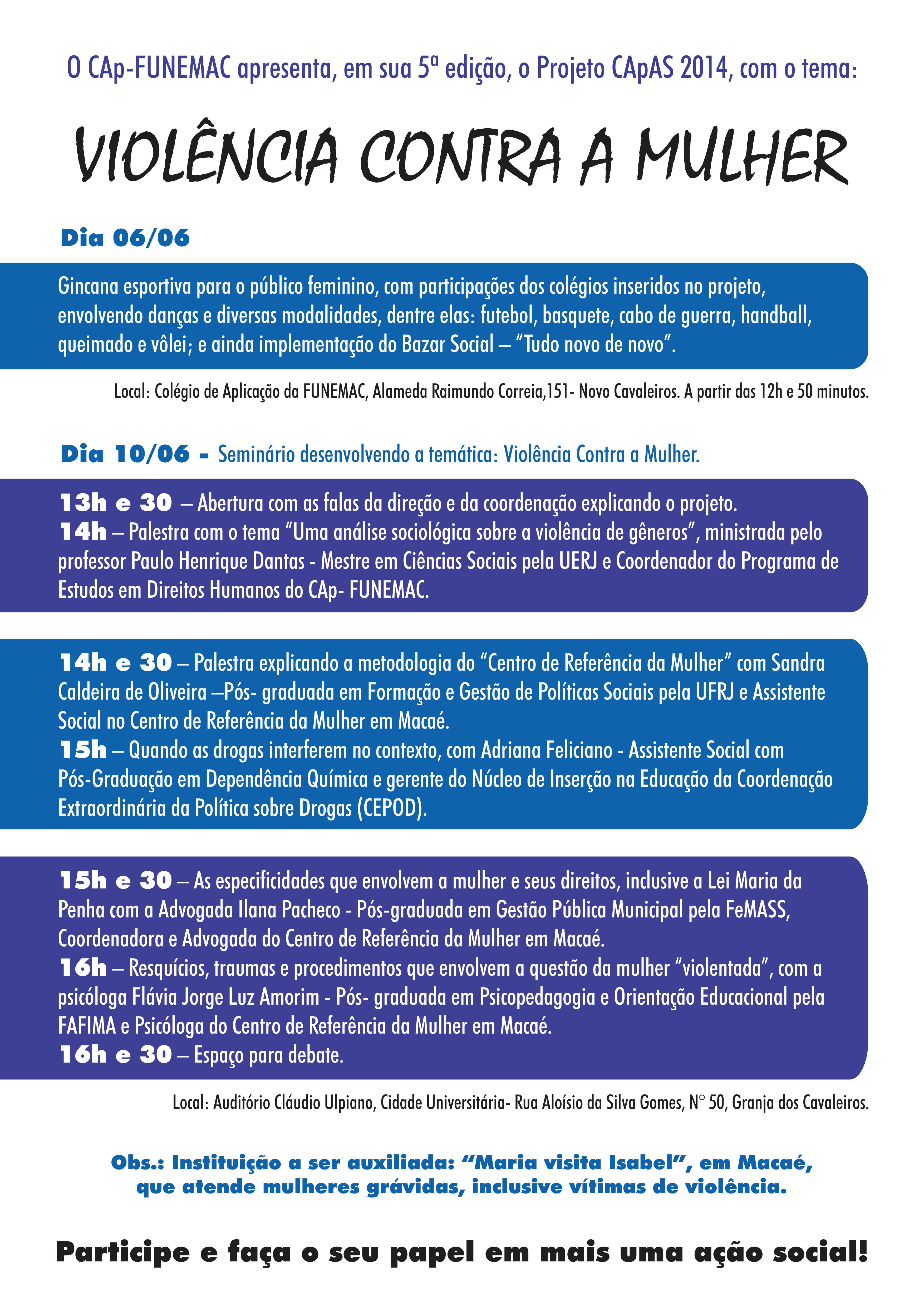 Atento às mudanças sociais, o Colégio de Aplicação da Fundação Educacional de Macaé (CAp-Funemac) apresenta em sua 5ª edição, o Projeto CApAS 2014, com o tema: “Violência Contra a Mulher”. Formado por duas etapas, o projeto tem início nesta sexta-feira (6), às 12h50, na sede do CAp-Funemac, com uma gincana esportiva e cultural para o público feminino, além de um bazar social.