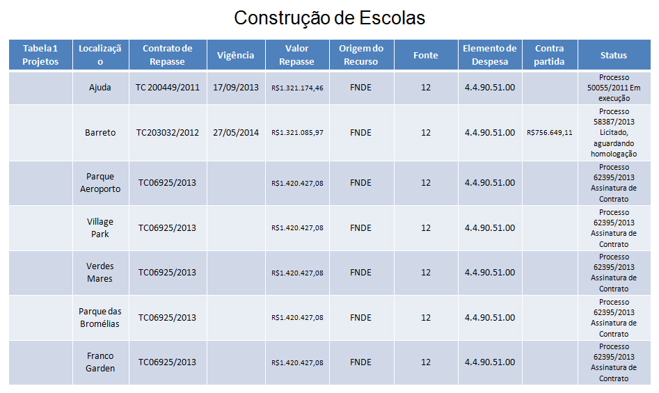 Abaixo, a relação de atividades e recursos contratados e em execução: