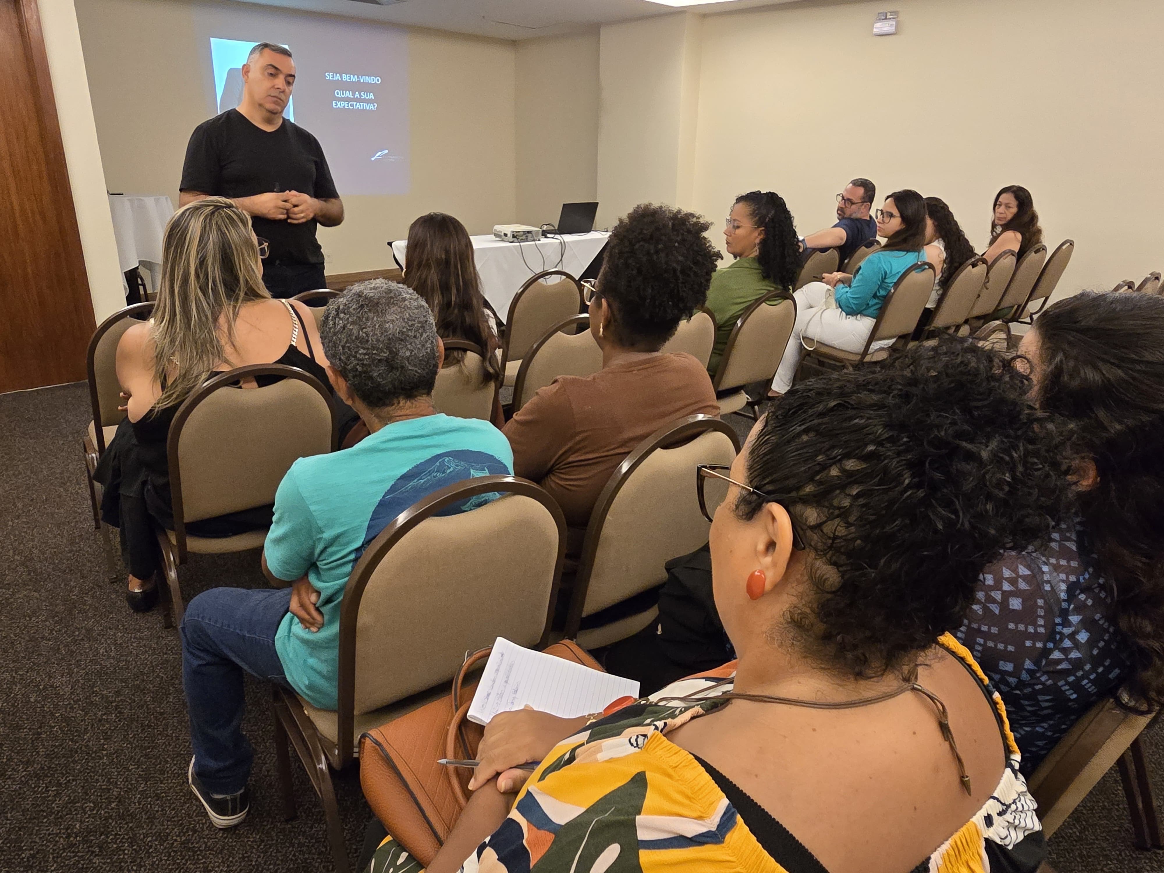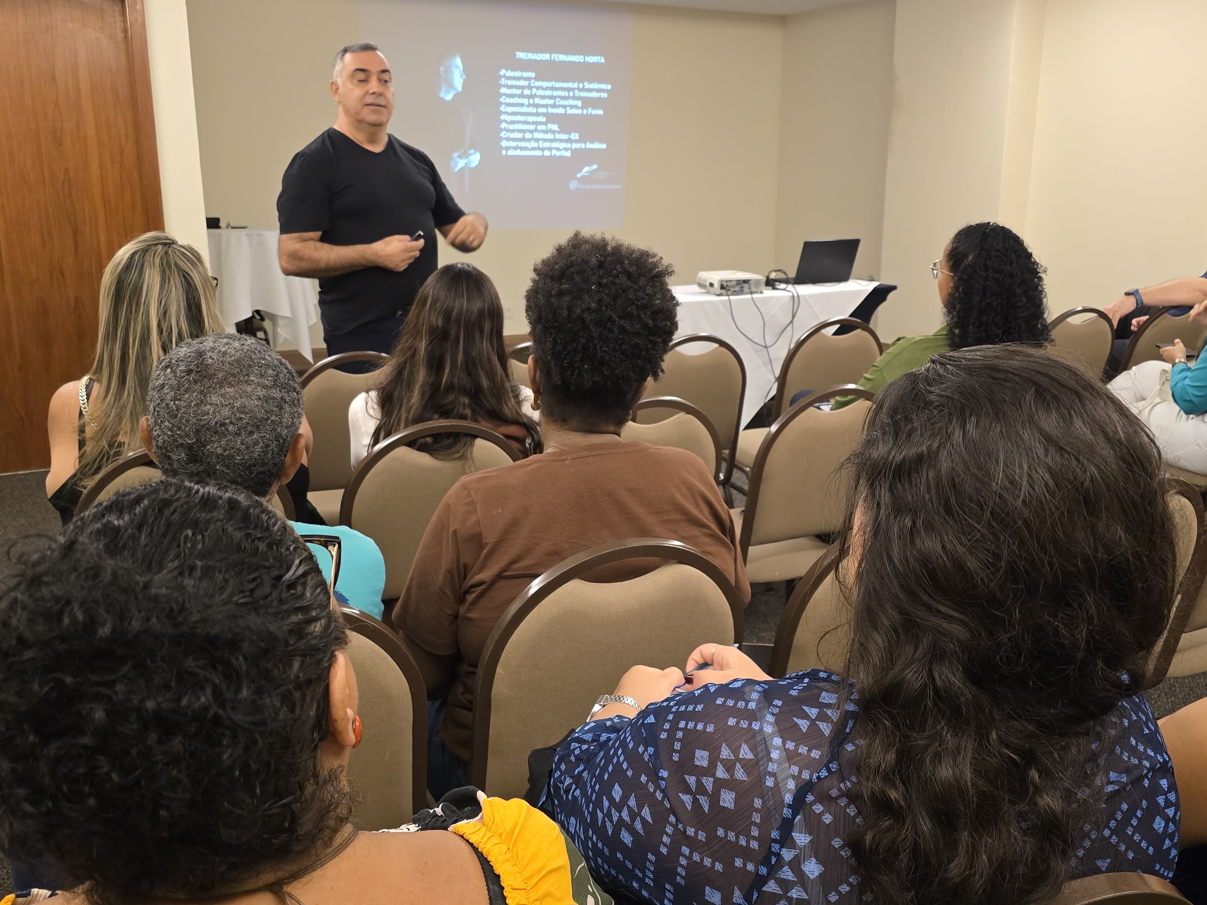 O facilitador Fernando Horta abordou o tema em cinco módulos interativos, que conduziram o público por uma jornada de aprendizado sobre atendimento, vendas e experiência do cliente.